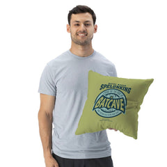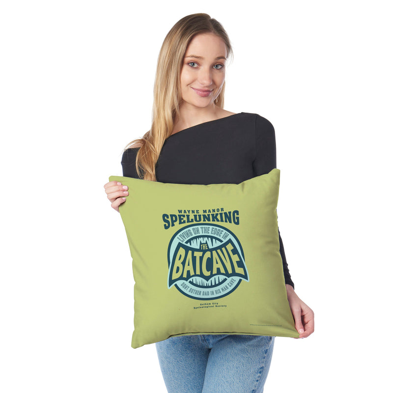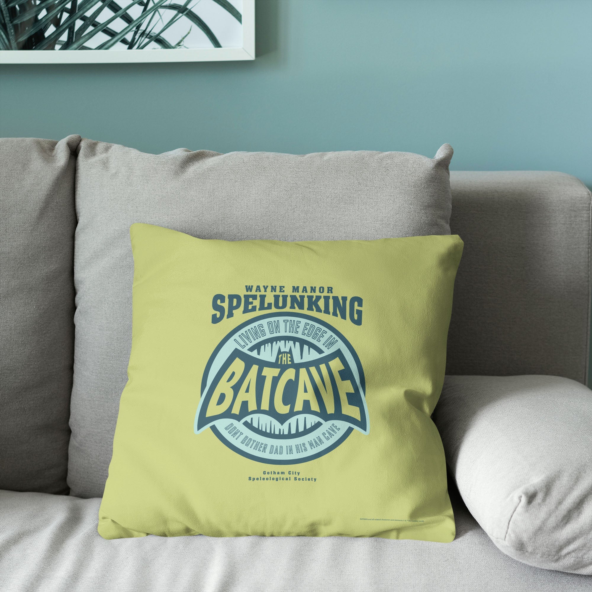 ? Featuring a bold design with the playful message "Living on the edge in the Batcave ¨C Don¡¯t bother Dad in his man cave," this pillow is perfect for any Batman fan.