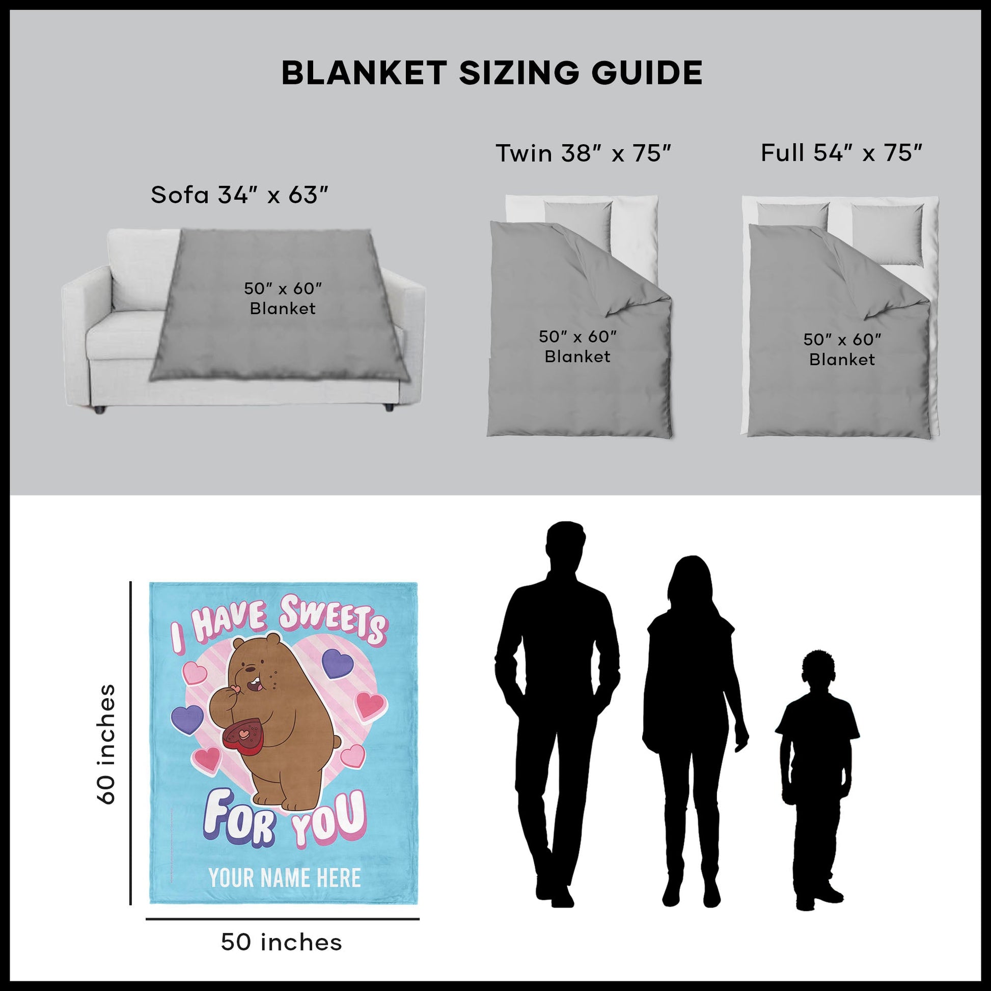 Bring a smile to your child's face with our We Bare Bears "Sweets For You" Soft and Comfortable Personalized Silk Touch Throw Blanket featuring their favorite characters. Measures 50 x 60 inches, making it the perfect size for snuggling while watching their favorite movie or show. Give this throw as an extra special gift or personalize one for yourself!