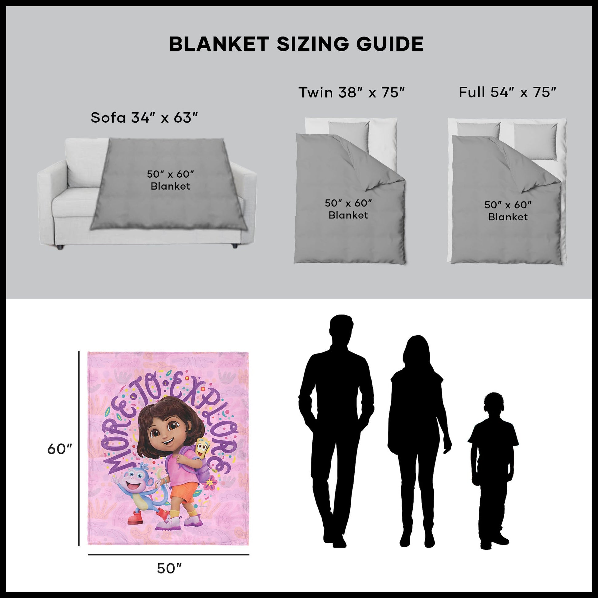 Set off on a new adventure with the Nickelodeon Dora the Explorer "More to Explore" Silk Touch Throw Blanket. Featuring Dora, Boots, and Map, this lively design bursts with color and excitement, showcasing the phrase "More to Explore" against a playful pink background decorated with confetti, flowers, and a sense of endless discovery. Made from ultra-soft silk touch fabric, this lightweight yet cozy throw is perfect for snuggling, decorating, or bringing along on exciting journeys. The fade-resistant print keeps the colors bold, while durable stitching ensures lasting comfort and durability. A fun and adventurous addition to any young explorer¡¯s space, this blanket brings warmth, joy, and curiosity to bedtime, playtime, or relaxation. Whether curling up after a day of exploring or brightening up a room, it¡¯s the perfect way to celebrate the adventurous spirit of Dora and her friends!