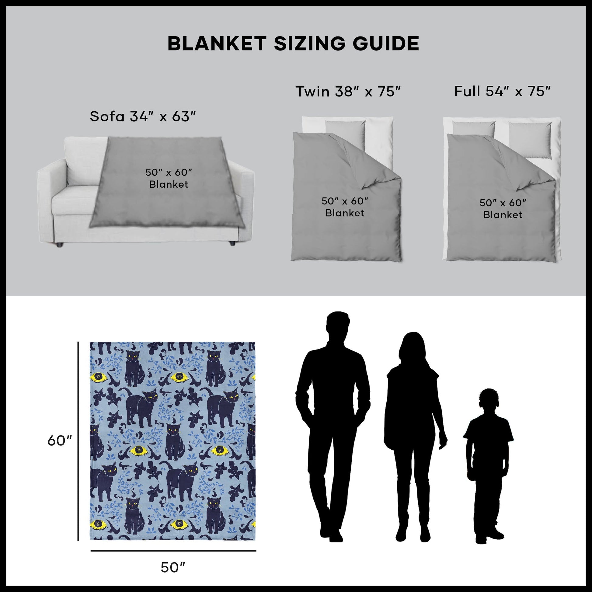 ? Features a playful pattern of black cats and watchful eyes scattered across a blue background. Perfect for curling up on the couch or adding a touch of magic to your bedroom, this blanket offers silky soft comfort that you'll love to snuggle into. The unique design brings a sense of fun and mystery, making it a standout piece in any room. Let the curious cats and their watchful eyes bring a sense of wonder and warmth to your everyday moments!