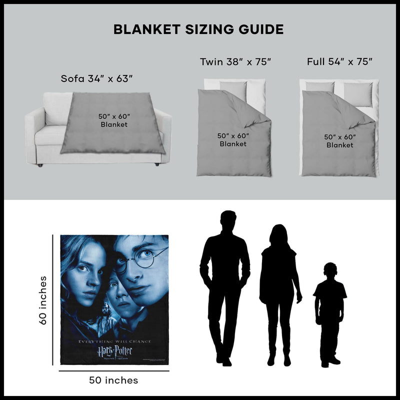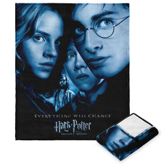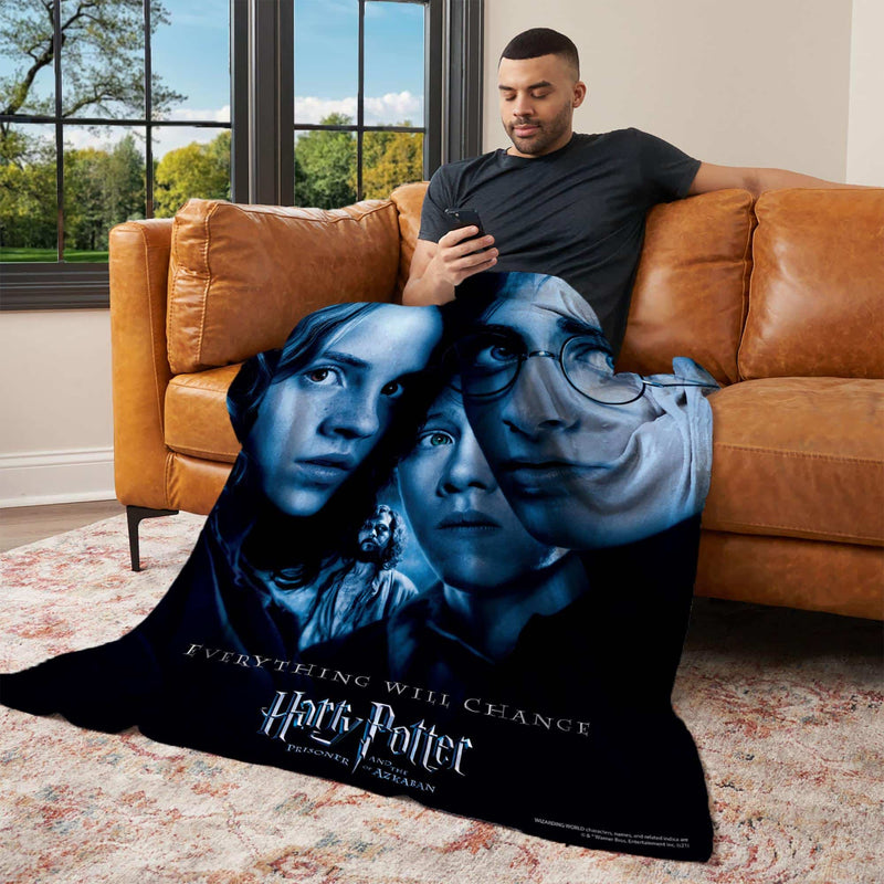 Experience the magic of Harry Potter with this luxurious silk touch throw blanket "Everything Will Change". Featuring the iconic Harry, Hermione, and Ron. The design showcases the captivating movie poster from Harry Potter and the Prisoner of Azkaban, adding a touch of enchantment to any room. Whether as a decorative piece or for snuggling up during movie nights, this blanket is a must-have for any Harry Potter enthusiast.