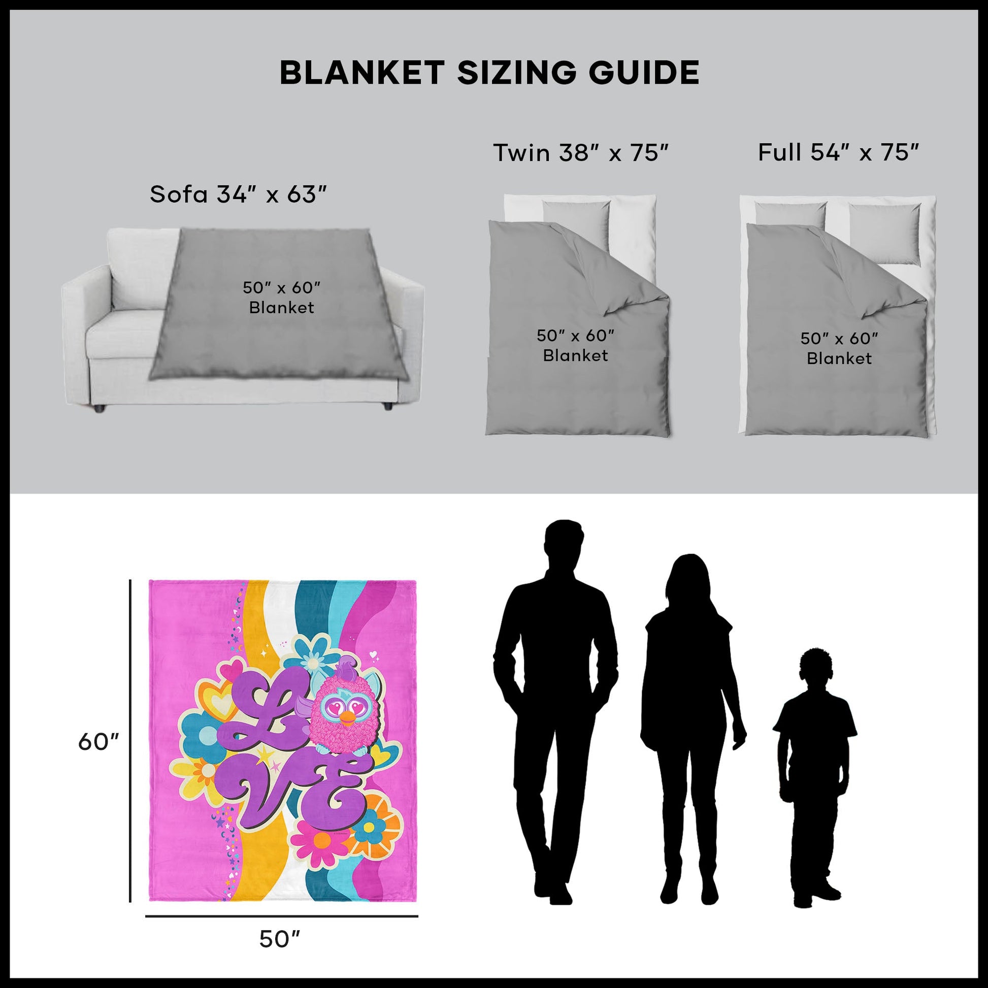 Get ready for a groovy cuddle session with the Hasbro Furby "Funky Furby" Silk Touch Throw Blanket. Featuring a fluffy Furby front and center, this blanket is a burst of personality. The playful 70s-inspired background adds a fun, retro flair that takes you back to the era of funky fashion and bold colors. Soft and silky to the touch, this throw wraps you in warmth while keeping the vibe lighthearted and full of energy. Whether you're lounging on the couch, relaxing in bed, or taking it on the go, the blanket¡¯s design and comfort make it the perfect companion. Furby's lovable and quirky expression adds a fun twist to your d¨¦cor.