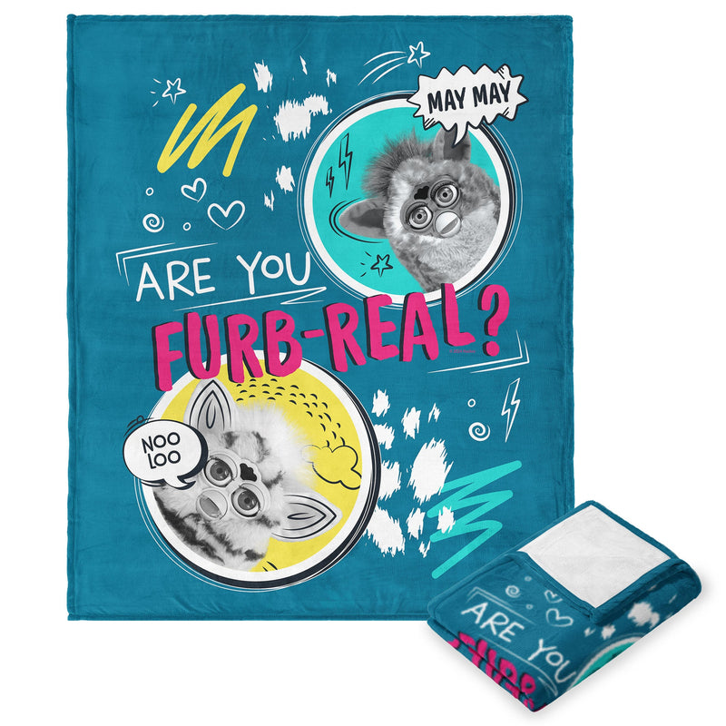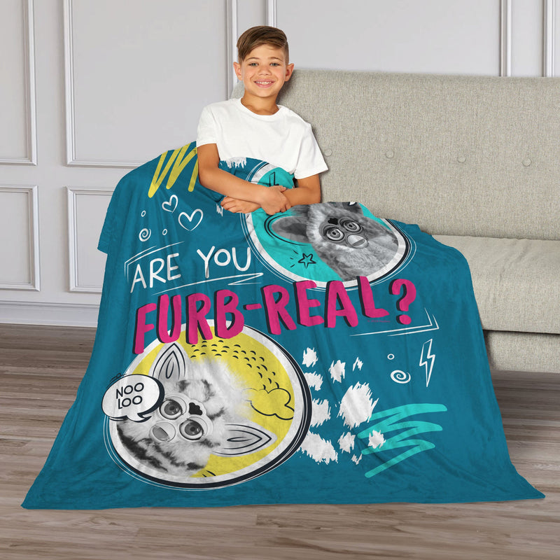 Meet the Hasbro Furby "Furby Real" Silk Touch Throw Blanket, where the question "Are You Furr-Real?" comes to life with a pair of playful Furbies. Their big, bright eyes and quirky expressions pop against a bold, colorful backdrop, adding a burst of fun to your space. These lovable creatures bring a touch of whimsy and nostalgia to every cuddle session. Super soft and silky, this throw blanket wraps you in warmth while keeping the vibe lighthearted and fun. Whether you're cozying up on the couch or adding a splash of personality to your bedroom, the Furby duo is always ready to join in on the fun. Their furry, friendly presence makes this blanket a perfect companion for any occasion.