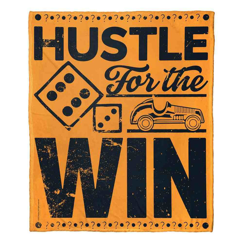 - Features the words "Hustle for the Win" with Dice and Monopoly game car