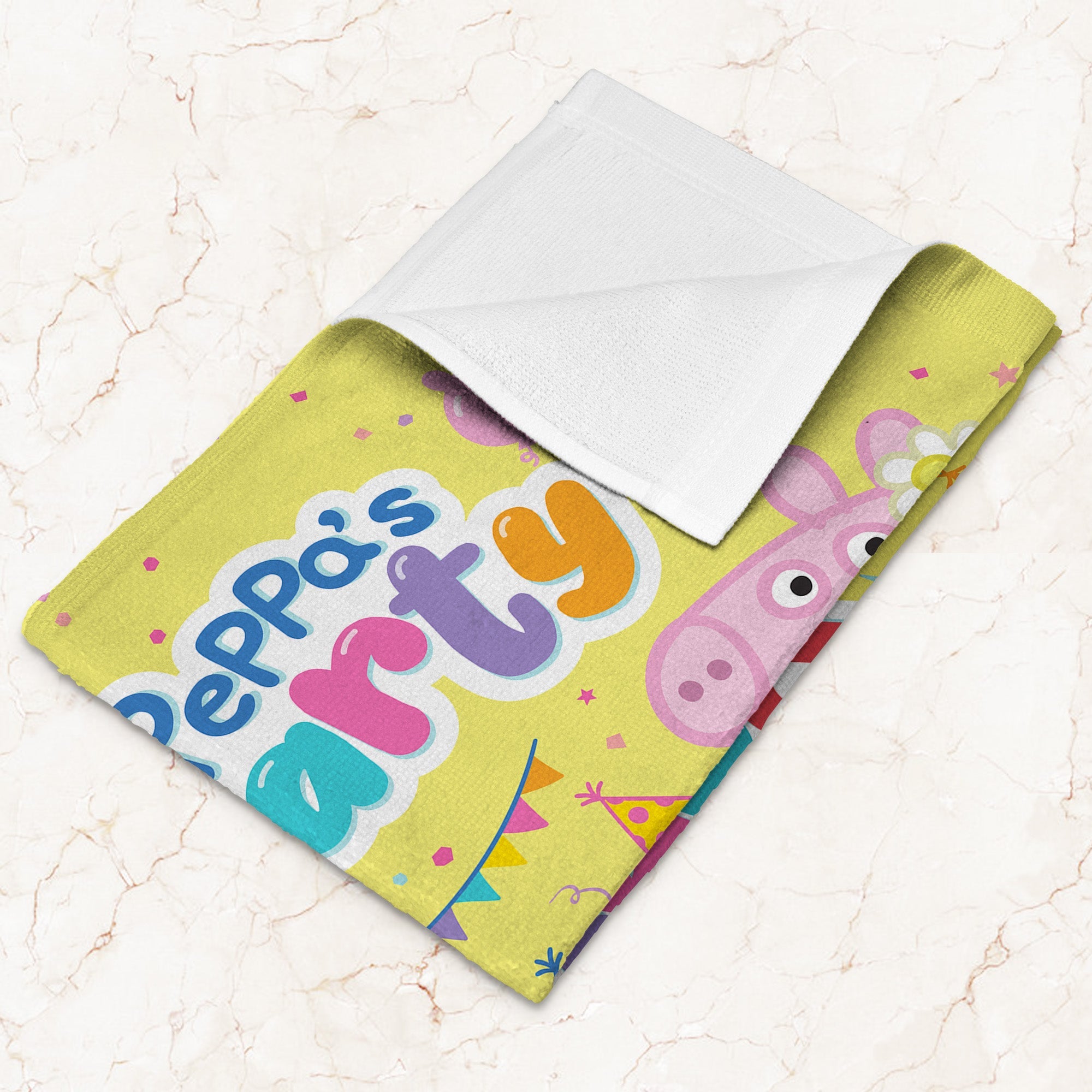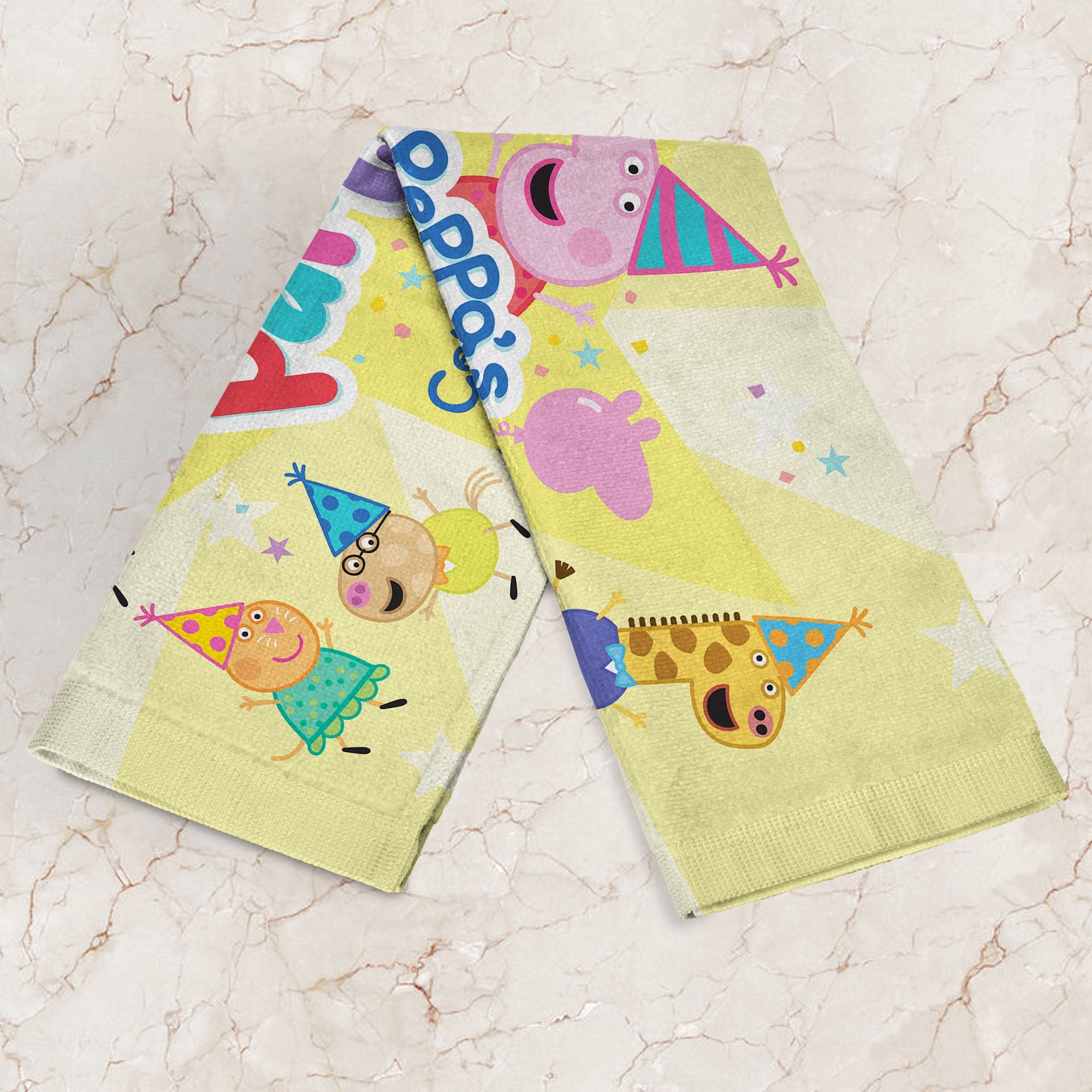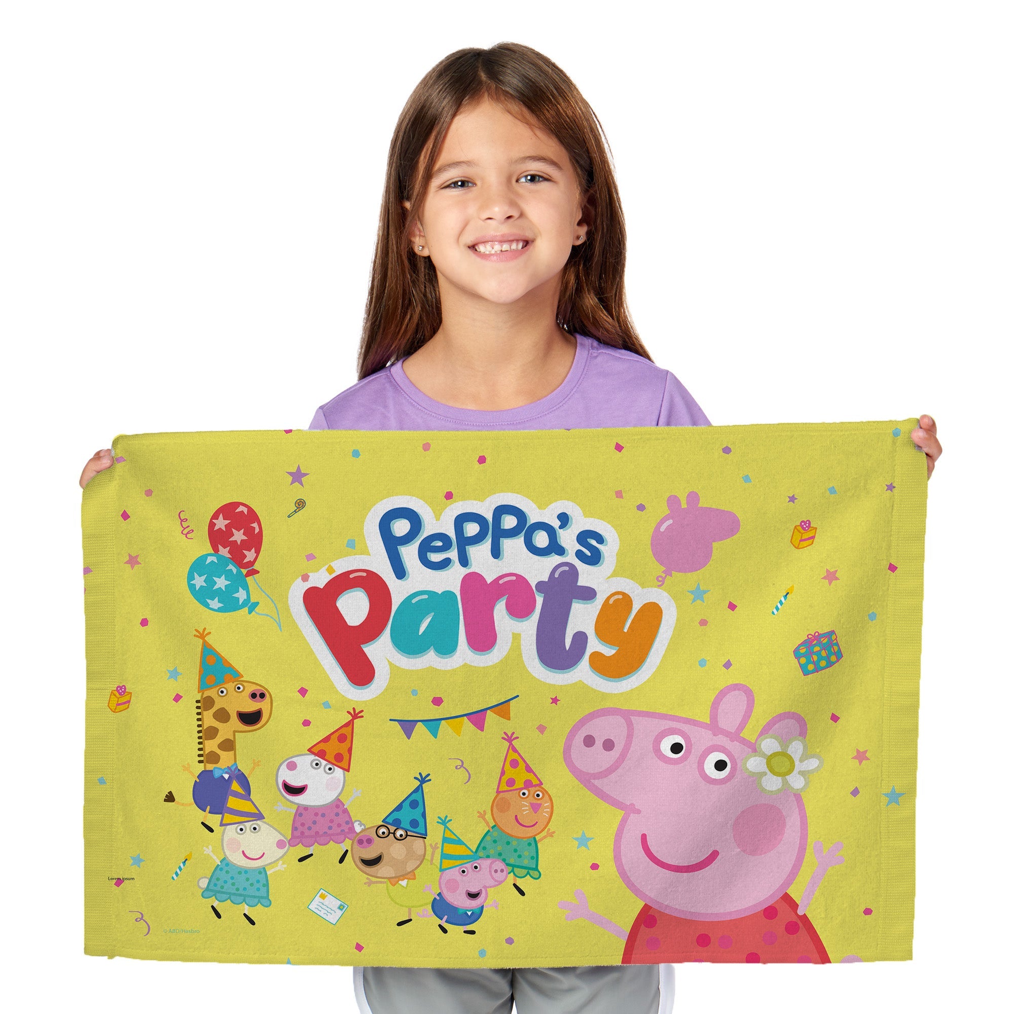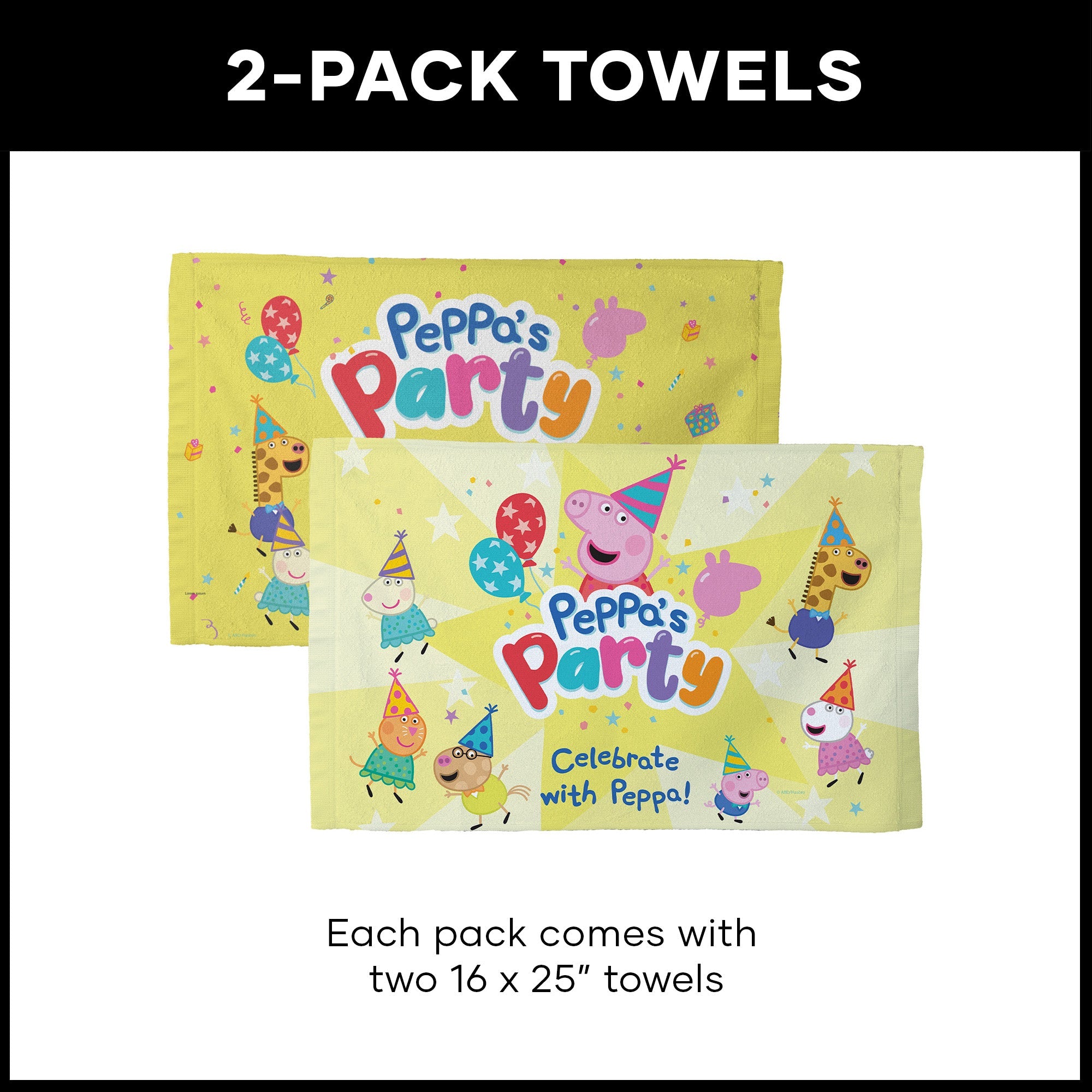 Add some Peppa Pig magic to your next celebration with the Hasbro Peppa Pig ¡°Celebrate With Peppa¡± Fan Towel 2 Pack! This set features two vibrant designs, each showcasing Peppa Pig in her festive party dress surrounded by all her friends. Each towel brings a different designed splash of joy with playful party-themed images filling the background. With their delightful designs and bright colors, they¡¯re perfect for fans of all ages looking to celebrate in Peppa style!