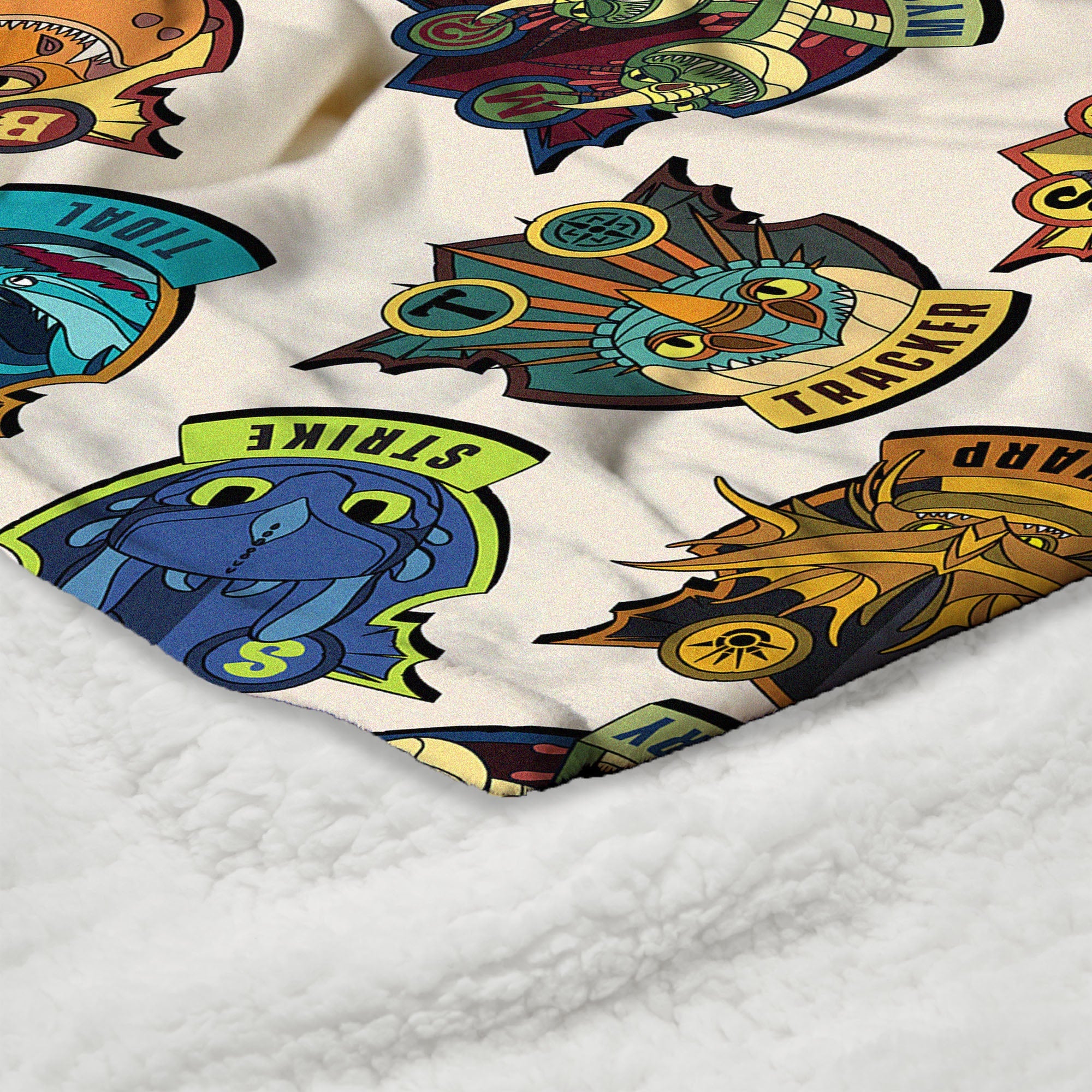 Celebrate every dragon class with the Universal How to Train Your Dragon ¡°Dragon Badges¡± Silk Touch Sherpa Throw Blanket, featuring colorful emblems like Strike, Tidal, Tracker, Mystery, Sharp, Boulder, and Stoker on a soft cream backdrop. Each badge pops with bold lines and vibrant hues, bringing the playful spirit of dragon training into your space while honoring the bond between Vikings and their dragons. Perfect for dreamers, young dragon riders, or longtime fans of the franchise, this ultra-soft blanket adds warmth and comfort to movie nights, bedtime, or any moment you want to curl up and let your imagination soar.