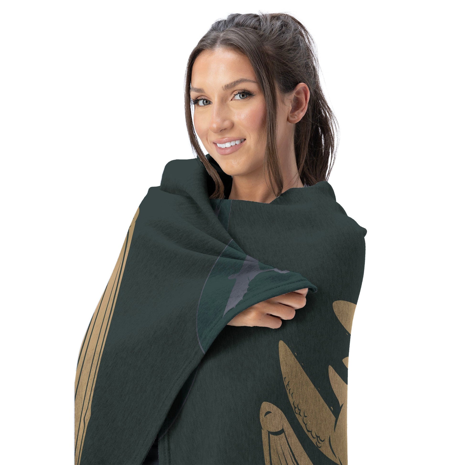 ? Oversized; super soft, silk touch fabric front; plush, neutral color sherpa back; decorative binding around all edges