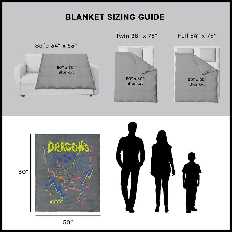 Bring electric dragon energy into your space with the Universal How to Train Your Dragon ¡°Neon Dragon¡± Silk Touch Sherpa Throw Blanket, featuring a bold outline of Toothless highlighted with neon yellow, blue, and pink accents, surrounded by lightning bolts, stars, and edgy graffiti-style ¡°DRAGONS¡± lettering. Made with ultra-soft silk touch fabric, it¡¯s the perfect blanket for snuggling during movie marathons, bedtime, or just lounging with your favorite dragon. Perfect for dragon fans who like their style a little more electric, this blanket wraps you in warmth while adding a pop of adventure to your day. Curl up and let Toothless¡¯s neon glow keep you comfy, whether you¡¯re drifting off to sleep or dreaming of your next flight through the skies of Berk.