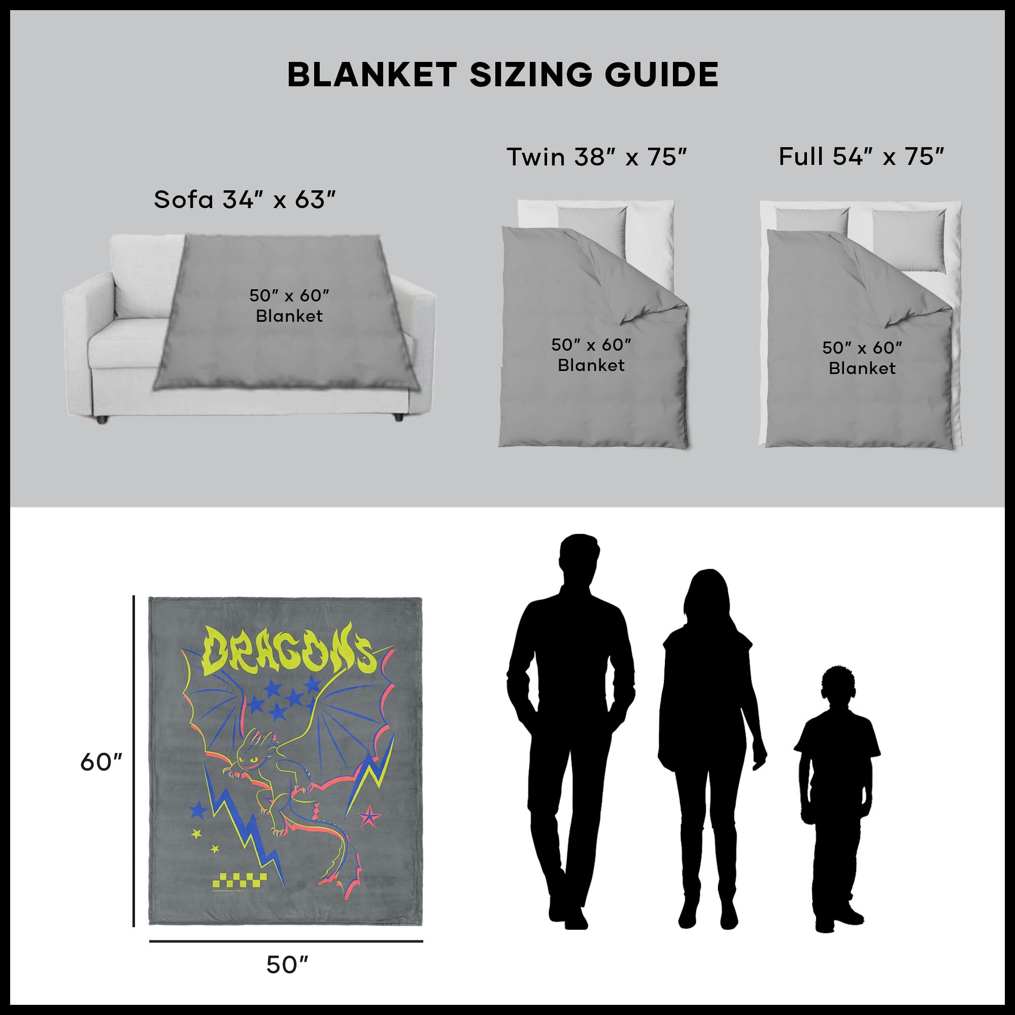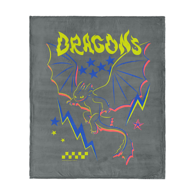 Bring electric dragon energy into your space with the Universal How to Train Your Dragon ¡°Neon Dragon¡± Silk Touch Throw Blanket, featuring a bold outline of Toothless highlighted with neon yellow, blue, and pink accents, surrounded by lightning bolts, stars, and edgy graffiti-style ¡°DRAGONS¡± lettering. Made with ultra-soft silk touch fabric, it¡¯s the perfect blanket for snuggling during movie marathons, bedtime, or just lounging with your favorite dragon. Perfect for dragon fans who like their style a little more electric, this blanket wraps you in warmth while adding a pop of adventure to your day. Curl up and let Toothless¡¯s neon glow keep you comfy, whether you¡¯re drifting off to sleep or dreaming of your next flight through the skies of Berk.