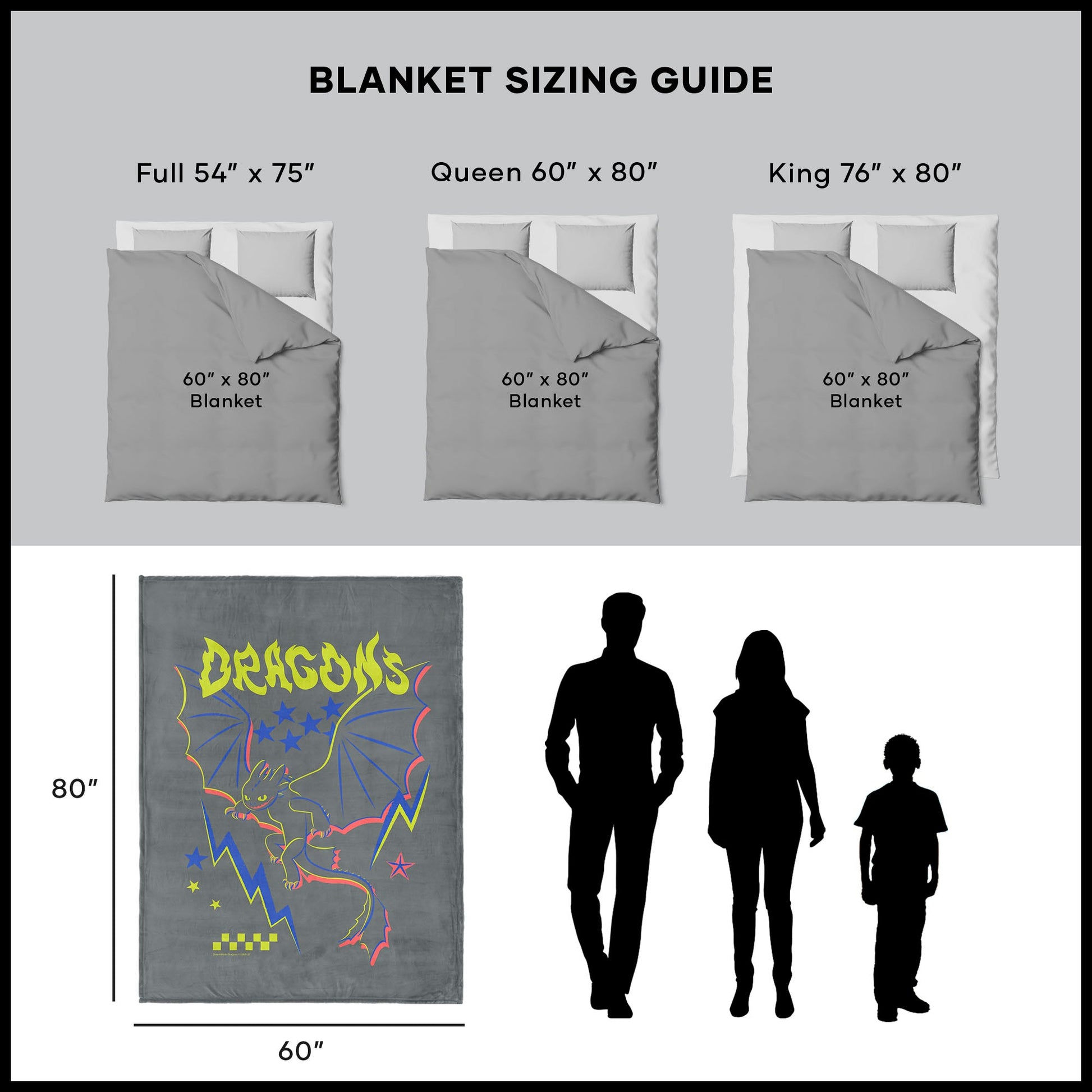 Bring electric dragon energy into your space with the Universal How to Train Your Dragon ¡°Neon Dragon¡± Silk Touch Throw Blanket, featuring a bold outline of Toothless highlighted with neon yellow, blue, and pink accents, surrounded by lightning bolts, stars, and edgy graffiti-style ¡°DRAGONS¡± lettering. Made with ultra-soft silk touch fabric, it¡¯s the perfect blanket for snuggling during movie marathons, bedtime, or just lounging with your favorite dragon. Perfect for dragon fans who like their style a little more electric, this blanket wraps you in warmth while adding a pop of adventure to your day. Curl up and let Toothless¡¯s neon glow keep you comfy, whether you¡¯re drifting off to sleep or dreaming of your next flight through the skies of Berk.