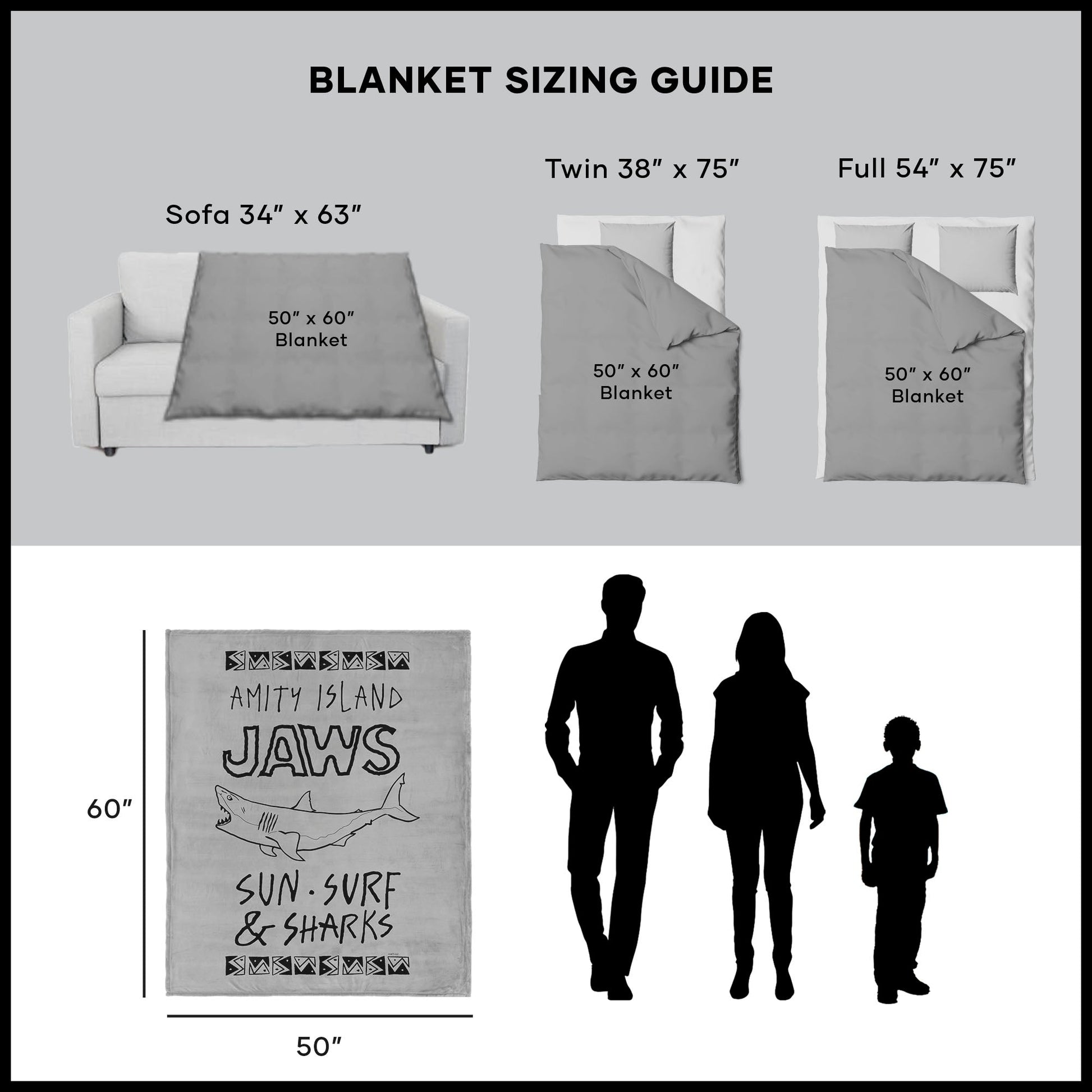 Sink into cozy island vibes with the Universal Jaws "Amity Island" Silk Touch Sherpa Throw Blanket, featuring a bold shark graphic, iconic Jaws lettering, and beachy "Sun, Surf & Sharks" slogan. Made with ultra-soft, velvety fabric, it's the perfect way to add a splash of cinematic fun to your movie nights or lazy weekends. Fans of the classic thriller will love wrapping up in this playful nod to Amity Island while staying warm and comfortable all year long. Lightweight yet plush, it's easy to drape over a couch, bed, or favorite chair for instant character. Whether you're gifting it to a fellow shark fan or treating yourself, this blanket brings a bite of nostalgia and a lot of softness to any space. Cuddle up, stay warm, and show your love for a timeless movie legend.