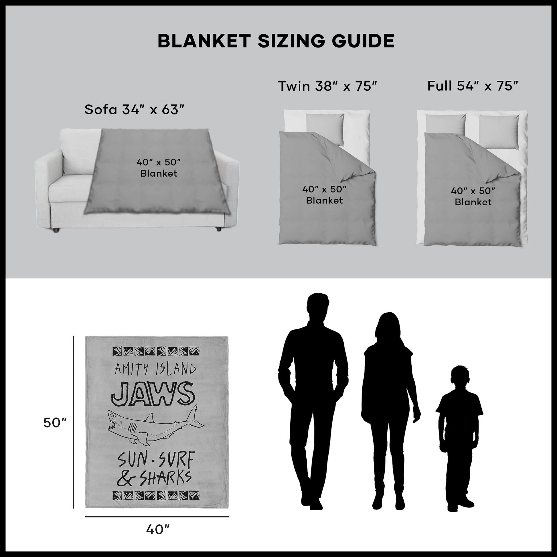 Sink into cozy island vibes with the Universal Jaws ¡°Amity Island¡± Silk Touch Throw Blanket, featuring a bold shark graphic, iconic Jaws lettering, and beachy ¡°Sun, Surf & Sharks¡± slogan. Made with ultra-soft, velvety fabric, it¡¯s the perfect way to add a splash of cinematic fun to your movie nights or lazy weekends. Fans of the classic thriller will love wrapping up in this playful nod to Amity Island while staying warm and comfortable all year long. Lightweight yet plush, it¡¯s easy to drape over a couch, bed, or favorite chair for instant character. Whether you¡¯re gifting it to a fellow shark fan or treating yourself, this blanket brings a bite of nostalgia and a lot of softness to any space. Cuddle up, stay warm, and show your love for a timeless movie legend.