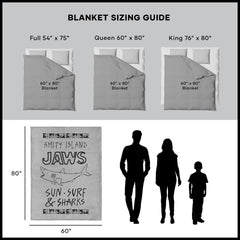 Sink into cozy island vibes with the Universal Jaws ¡°Amity Island¡± Silk Touch Throw Blanket, featuring a bold shark graphic, iconic Jaws lettering, and beachy ¡°Sun, Surf & Sharks¡± slogan. Made with ultra-soft, velvety fabric, it¡¯s the perfect way to add a splash of cinematic fun to your movie nights or lazy weekends. Fans of the classic thriller will love wrapping up in this playful nod to Amity Island while staying warm and comfortable all year long. Lightweight yet plush, it¡¯s easy to drape over a couch, bed, or favorite chair for instant character. Whether you¡¯re gifting it to a fellow shark fan or treating yourself, this blanket brings a bite of nostalgia and a lot of softness to any space. Cuddle up, stay warm, and show your love for a timeless movie legend.