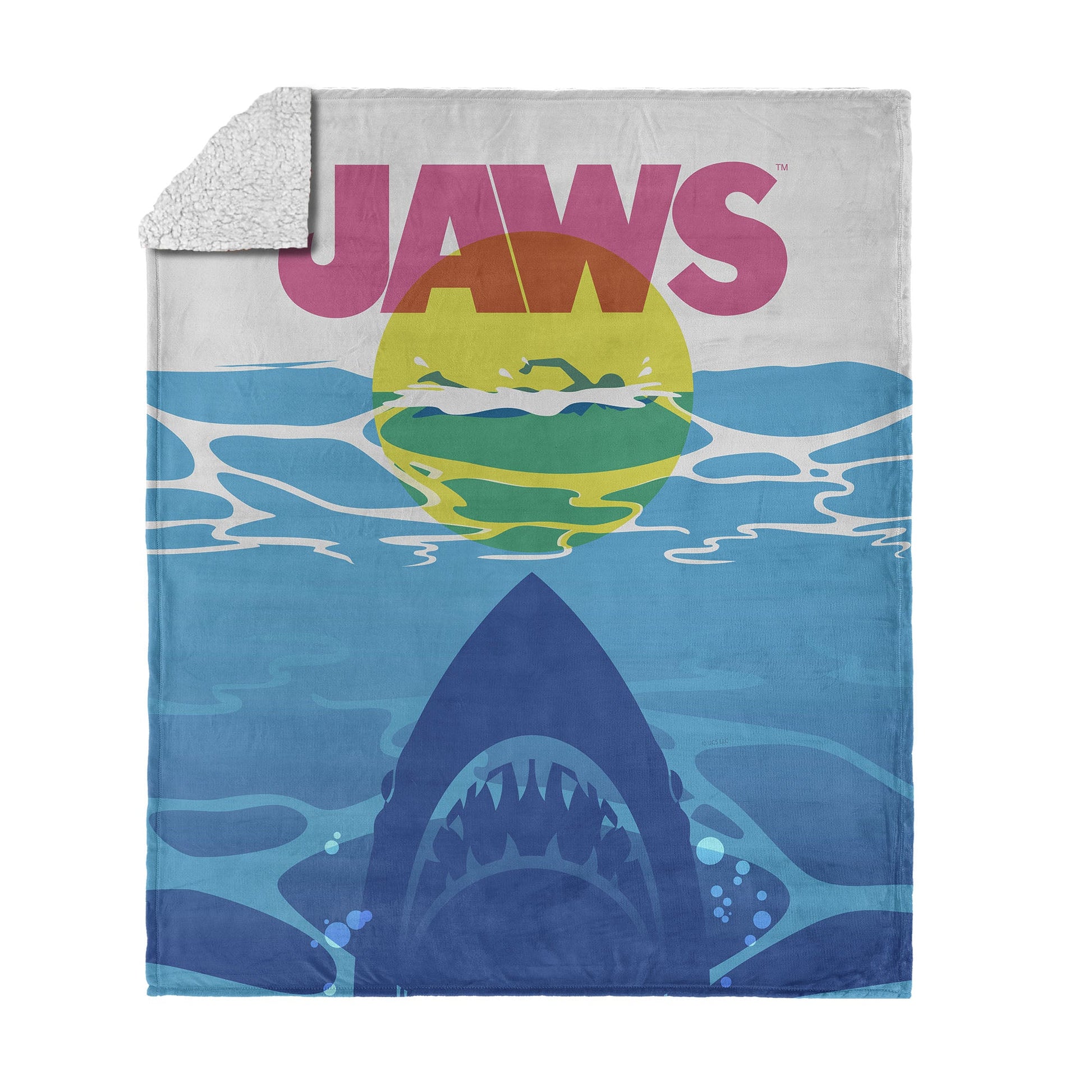 Make waves on your next movie night with the Universal Jaws "CMYK Poster" Silk Touch Sherpa Throw Blanket, featuring a bold retro-inspired design of the iconic shark silhouette, colorful sunset, and swimmer above. Made with ultra-soft, velvety fabric, it's the perfect mix of vintage poster art and cozy comfort for fans of the classic thriller. Bright pops of color and striking graphics add a playful twist to any couch, bed, or home theater setup. Lightweight yet plush, it's great for snuggling up during a Jaws marathon or displaying as a standout statement piece. Perfect for gifting to shark lovers or keeping all to yourself, this blanket captures the timeless suspense of Jaws with a fresh, vibrant look. Dive in, get cozy, and celebrate your favorite movie in style.