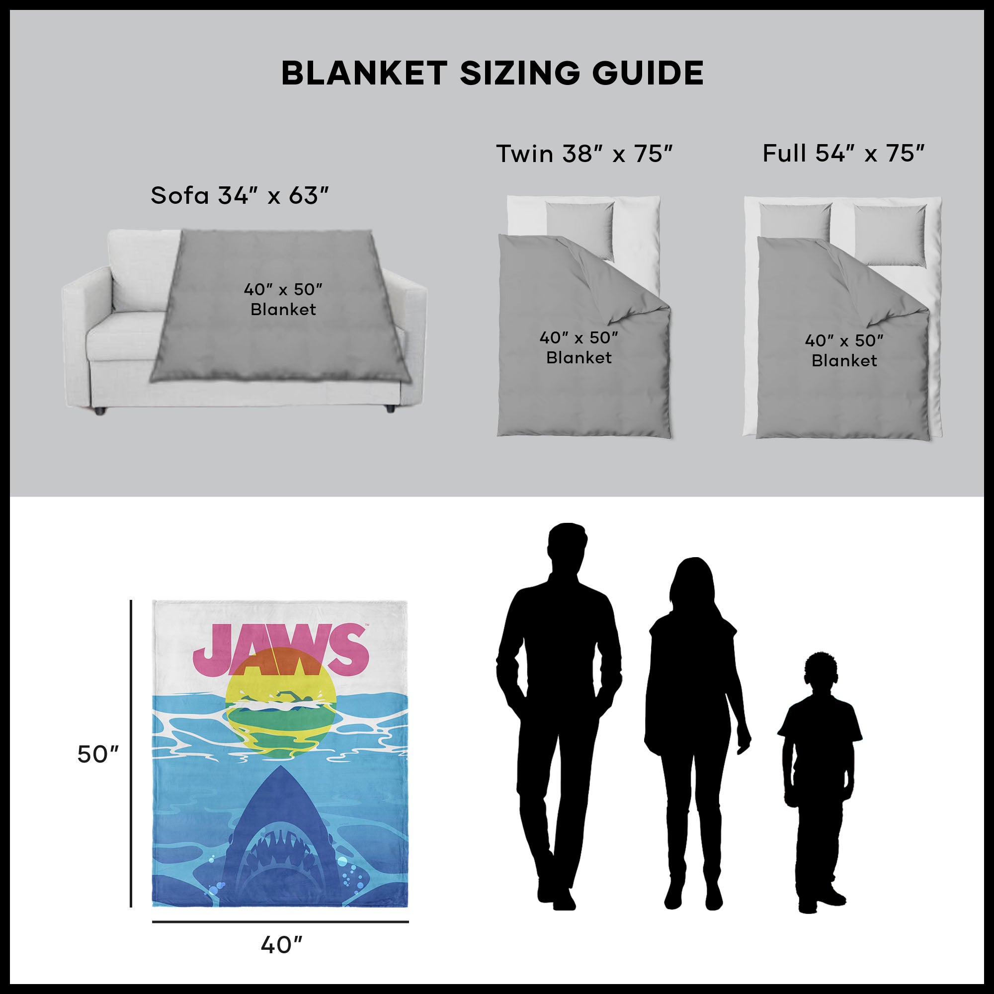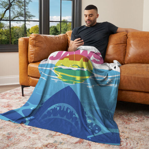Make waves on your next movie night with the Universal Jaws ¡°CMYK Poster¡± Silk Touch Throw Blanket, featuring a bold retro-inspired design of the iconic shark silhouette, colorful sunset, and swimmer above. Made with ultra-soft, velvety fabric, it¡¯s the perfect mix of vintage poster art and cozy comfort for fans of the classic thriller. Bright pops of color and striking graphics add a playful twist to any couch, bed, or home theater setup. Lightweight yet plush, it¡¯s great for snuggling up during a Jaws marathon or displaying as a standout statement piece. Perfect for gifting to shark lovers or keeping all to yourself, this blanket captures the timeless suspense of Jaws with a fresh, vibrant look. Dive in, get cozy, and celebrate your favorite movie in style.