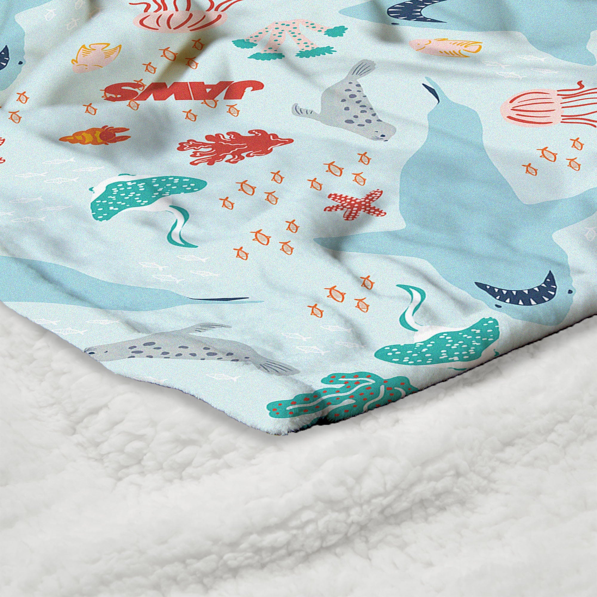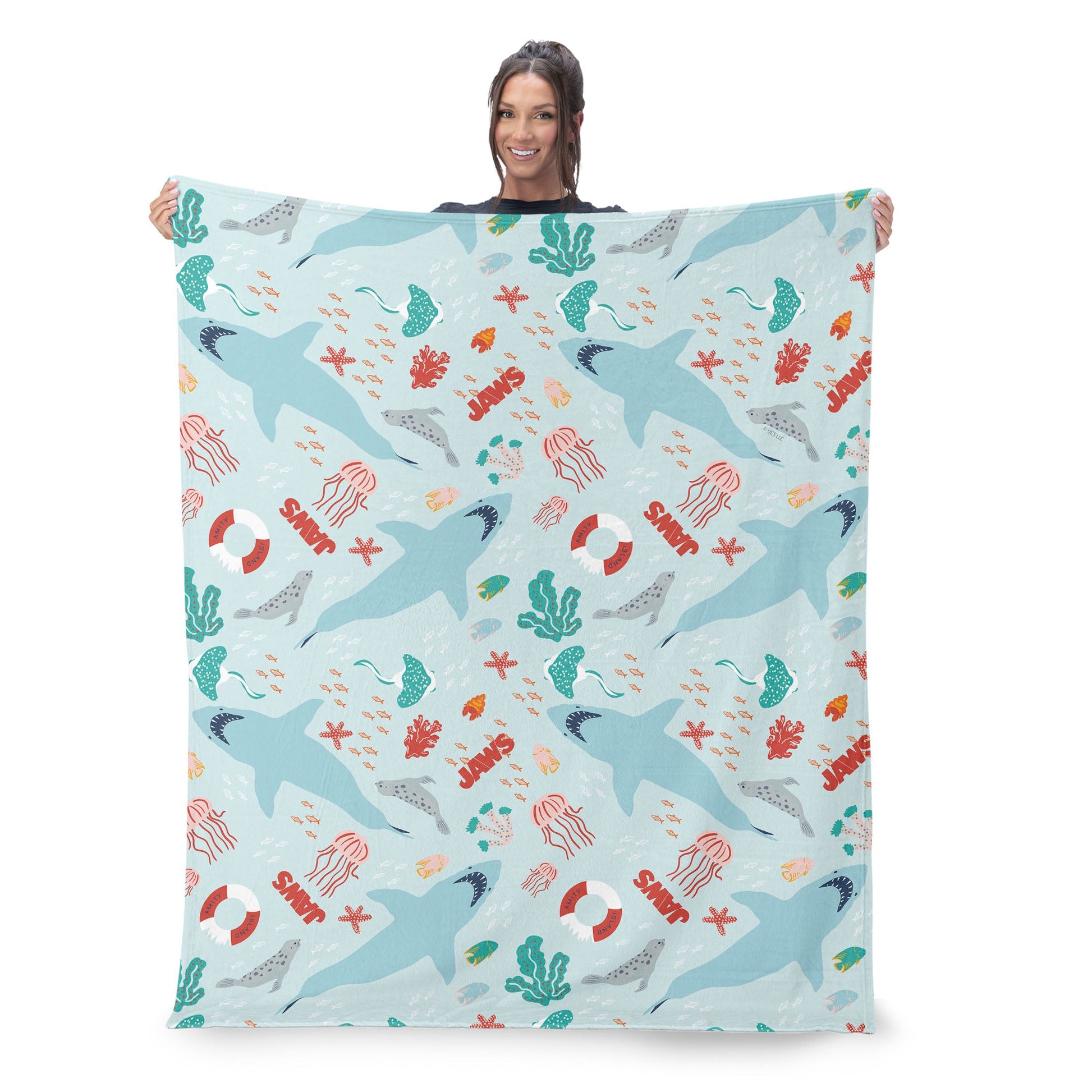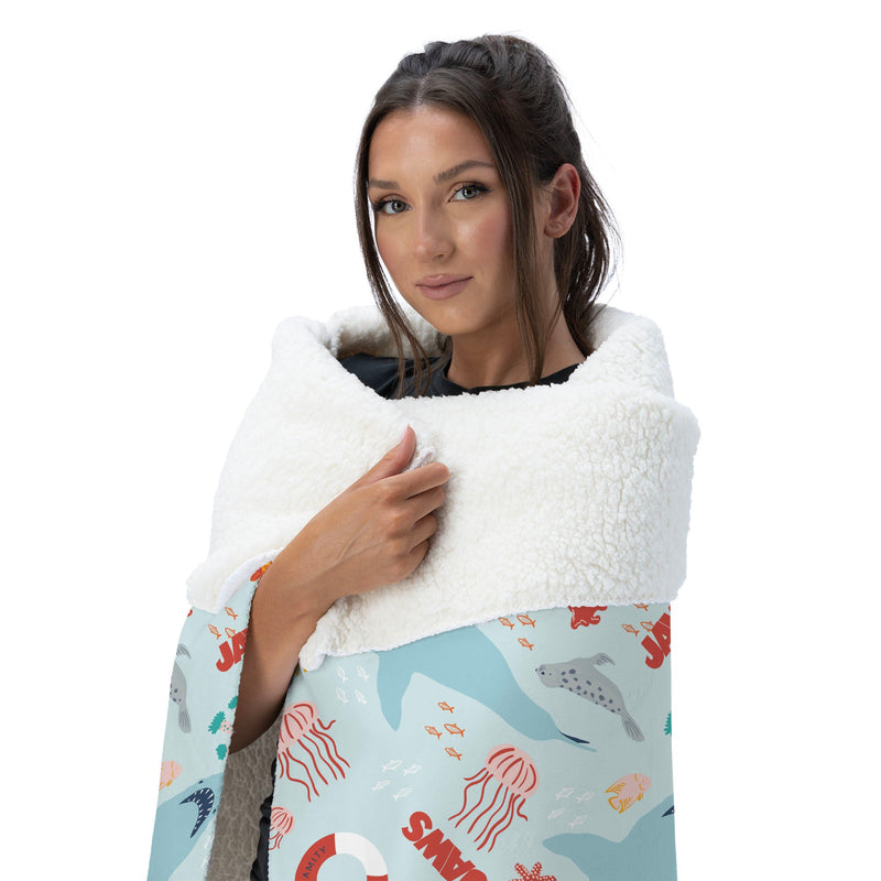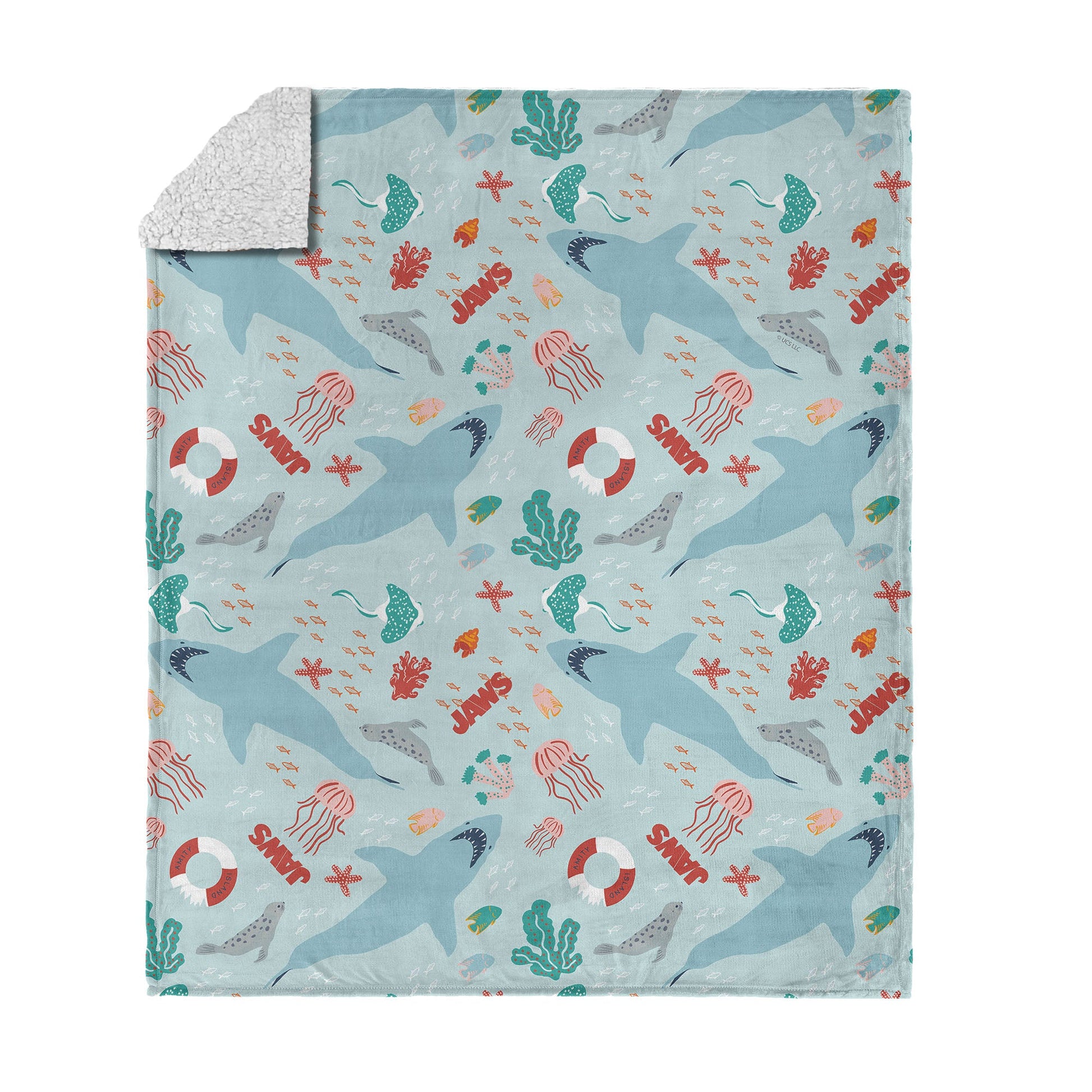 Dive into ocean vibes with the Universal Jaws "Coastal Sharks" Silk Touch Sherpa Throw Blanket, featuring a playful repeating pattern of sharks, seals, jellyfish, coral, and the iconic Jaws logo. Made with ultra-soft, velvety fabric, it's perfect for adding a splash of seaside fun to your movie nights or cozy afternoons. Fans of the classic thriller will love how this blanket mixes lighthearted coastal elements with a nod to their favorite shark movie. Lightweight yet plush, it's easy to toss on a couch, bed, or lounge chair for instant comfort and character. Whether you're gifting it to a fellow fan or keeping it all to yourself, this throw adds a pop of underwater adventure to any space. Snuggle up and show your love for sun, surf, and sharks with a blanket that's as soft as it is fun.