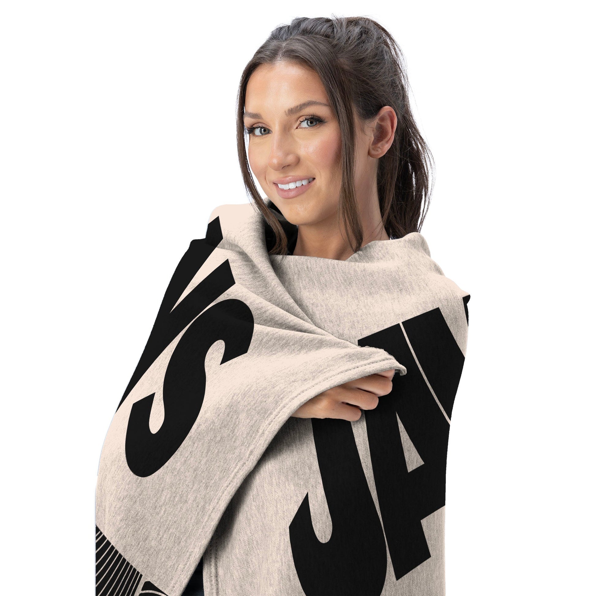 ? Oversized; super soft, silk touch fabric front; plush, neutral color sherpa back; decorative binding around all edges