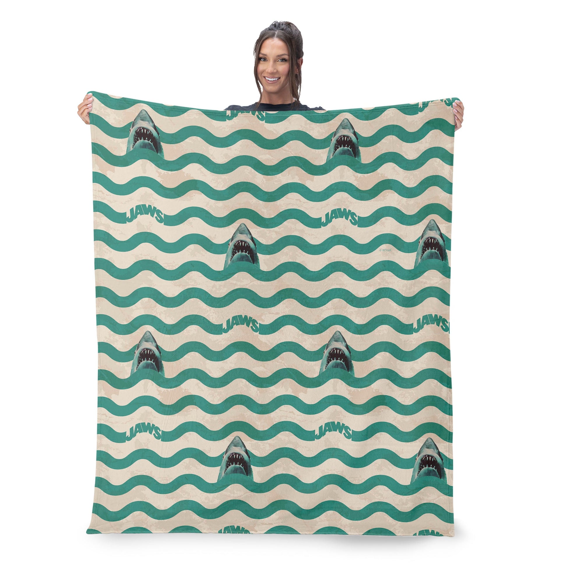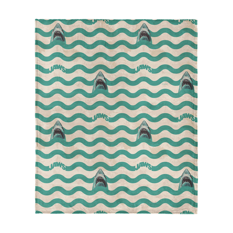 Make a splash in your space with the Universal Jaws ¡°Psychedelic Sea¡± Silk Touch Throw Blanket, featuring a groovy repeating pattern of wavy teal stripes and the iconic shark head peeking through. Made with ultra-soft, velvety fabric, it¡¯s the perfect blend of retro style and cozy movie-night comfort for fans of the classic thriller. Bold colors and hypnotic waves add a fun twist to any bed, couch, or home theater, while the repeating design keeps your Jaws fandom front and center. Lightweight yet plush, it¡¯s easy to grab for extra warmth or to display as a standout accent. Perfect for gifting or treating yourself, this blanket delivers a soft, laid-back vibe with a touch of suspenseful nostalgia. Wrap up, relax, and channel your inner shark fan every time you cuddle up.