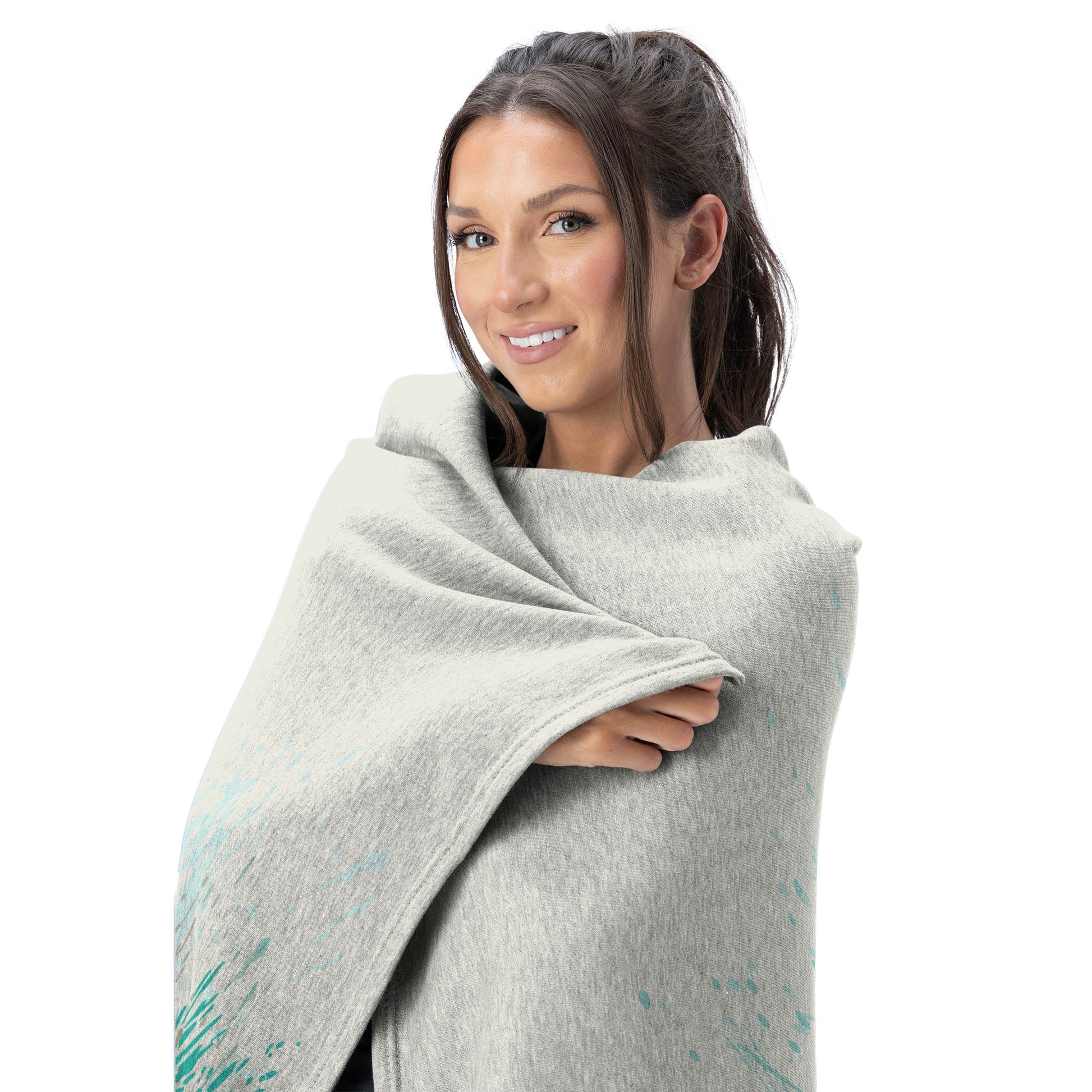 ? Oversized; super soft, silk touch fabric front; plush, neutral color sherpa back; decorative binding around all edges