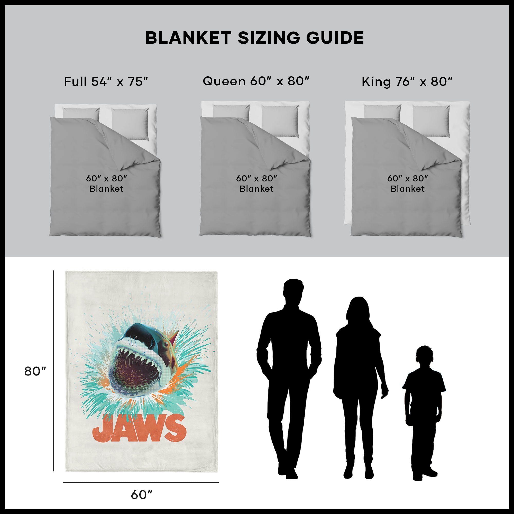 Make your lounge time pop with the Universal Jaws ¡°Shark Splash¡± Silk Touch Throw Blanket, featuring a fierce open-mouthed shark bursting through a splash of vibrant teal, orange, and white with bold Jaws lettering underneath. Made with ultra-soft, velvety fabric, it¡¯s the ultimate statement piece for cozy movie nights and fans of the legendary thriller. Bright colors and dynamic artwork bring big energy to any couch, bed, or fan cave, creating a standout accent that¡¯s as fun as it is comfy. Lightweight yet plush, it¡¯s easy to grab for extra warmth while watching your favorite shark scenes. Perfect for gifting to fellow Jaws lovers or keeping all to yourself, this blanket delivers nostalgic chills with a modern twist. Snuggle up, stay warm, and show off your love for one of cinema¡¯s most unforgettable creatures.