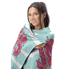 ? Oversized; super soft, silk touch fabric front; plush, neutral color sherpa back; decorative binding around all edges
