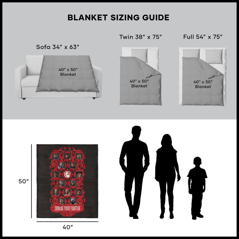 Get ready to enter the arena with the Mortal Kombat ¡°Choose Your Fighter¡± Silk Touch Throw Blanket. Featuring a bold, eye-catching design, this blanket showcases a roster of iconic Mortal Kombat characters, from Scorpion to Sub-Zero and beyond. Each fighter¡¯s face is captured in stunning detail, framed by a red and black border that represents the fierce nature of the Mortal Kombat universe. The vibrant ¡°Choose Your Fighter¡± slogan at the bottom of the blanket adds an interactive and fun element, inviting fans to pick their favorite character. Whether you¡¯re a fan of the original fighters or the newer faces, this blanket brings the excitement and intensity of the game directly to your living space. It¡¯s the perfect tribute to the legendary franchise, immortalizing the warriors who have become icons. Ideal for game rooms, cozy nights in, or as a display piece for Mortal Kombat enthusiasts, this Silk Touch Throw Blanket offers comfort while celebrating the action-packed world of Mortal Kombat. Don¡¯t miss out on the chance to add this ultimate piece to your collection!