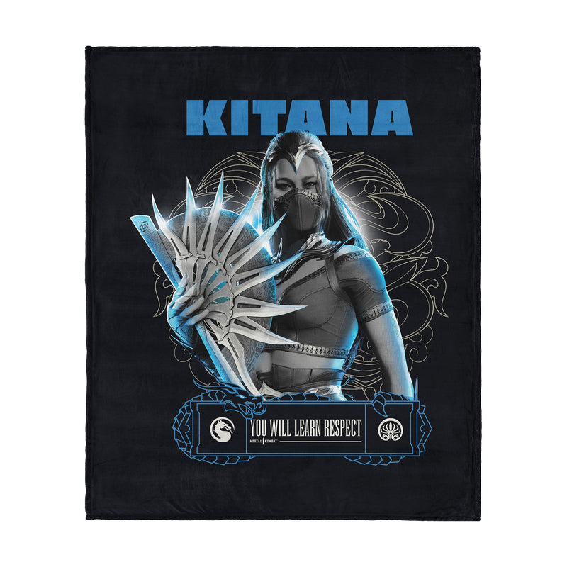 Kitana commands attention in the Mortal Kombat "Learn Respect" Silk Touch Throw Blanket, delivering a powerful message with style and precision. Featuring a striking graphic of Kitana wielding her iconic steel fans, the design is set against swirling ornamental patterns and her name boldly displayed across the top. Below, her quote ¡°You Will Learn Respect¡± is framed between the Mortal Kombat dragon logo and the symbol of her royal lineage. Crafted for everyday comfort, the silk touch fabric offers an ultra-soft feel with a smooth, velvety finish. Lightweight and warm, it¡¯s perfect for relaxing during game nights, movie marathons, or adding a bold layer to your bed or couch. High-quality printing ensures the vivid colors and sharp details hold strong through regular use and washing. Infuse your space with warrior energy and fierce elegance. Ideal for Mortal Kombat fans who stand for strength, loyalty, and unshakable style, just like Princess Kitana herself.