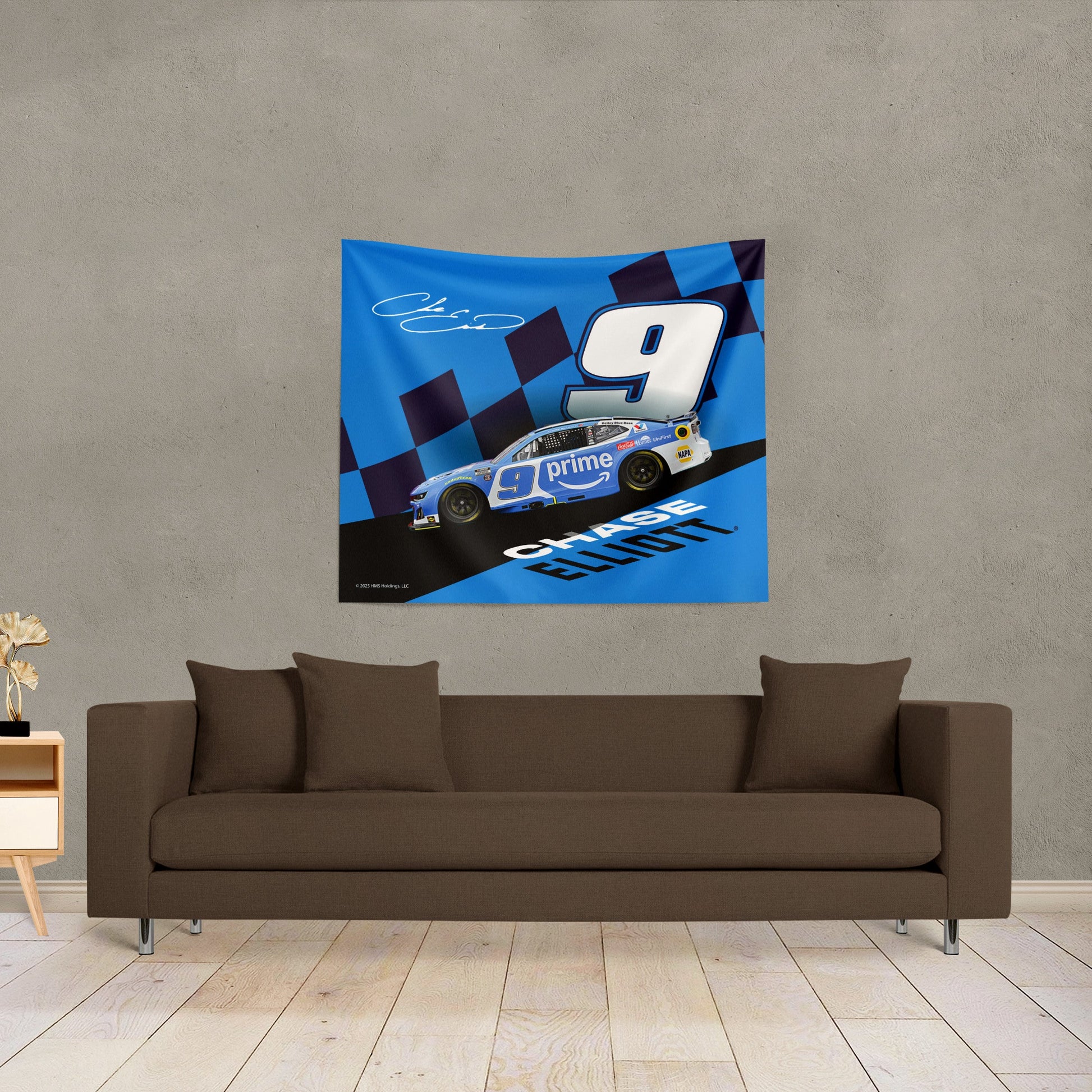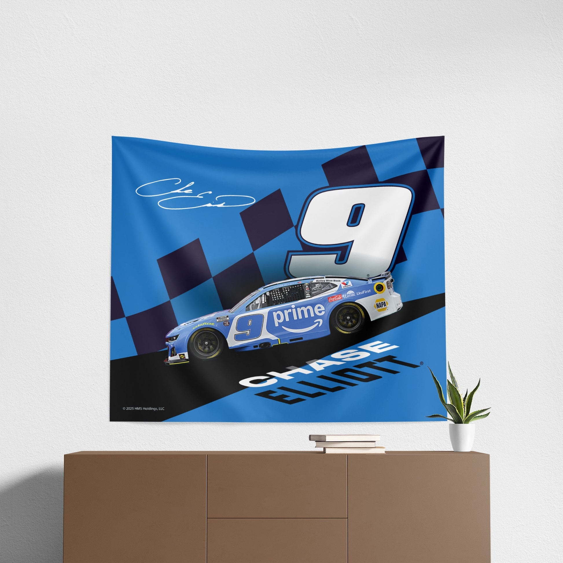 ? Featuring Chase Elliot's signature No. 9 car in motion across a dramatic slanted track design, complete with bold checkered flag accents, his autograph, and large block lettering of his name.