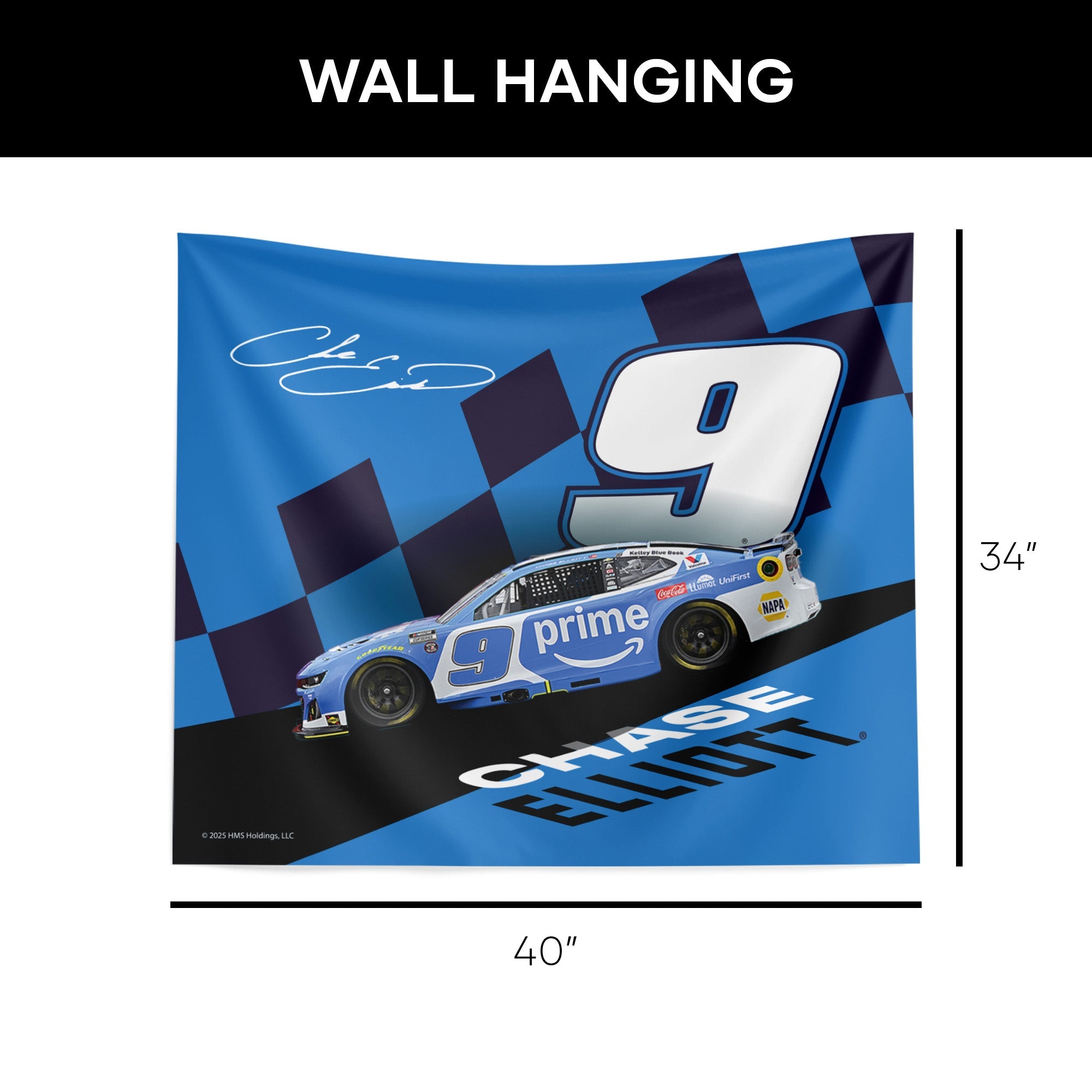 Bring race-day excitement to your space with the NASCAR Chase Elliott ¡°Slanted Track¡± Wall Hanging, featuring his signature No. 9 car in motion across a dramatic angled track design, complete with bold checkered flag accents, his autograph, and large block lettering of his name. Perfect for transforming any room into a racing retreat, this eye-catching piece instantly adds energy to game rooms, dorms, garages, or offices. Lightweight and easy to hang, it¡¯s crafted for fans who want to showcase their loyalty in a big way without any hassle. Whether you¡¯re hosting a watch party or just want to keep race-day vibes alive all year long, this wall hanging makes every space feel like the winner¡¯s circle.