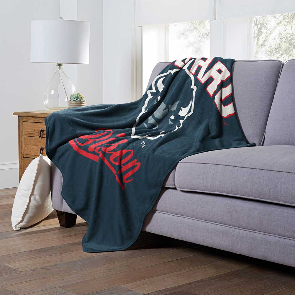 Proudly show off your alma mater or the school you love to root for with this Officially Licensed NCAA "Alumni" Silk Touch Throw Blanket by TheNorthwest. This cozy throw blanket is the perfect game day accessory. This 50"x 60" silky-soft throw blanket is perfect for keeping warm at the game, using on a picnic, or cuddling under on your couch. It boldly features a retro school logo in the center, surrounded by the team name, on a solid color background. This throw has a neutral color backside.