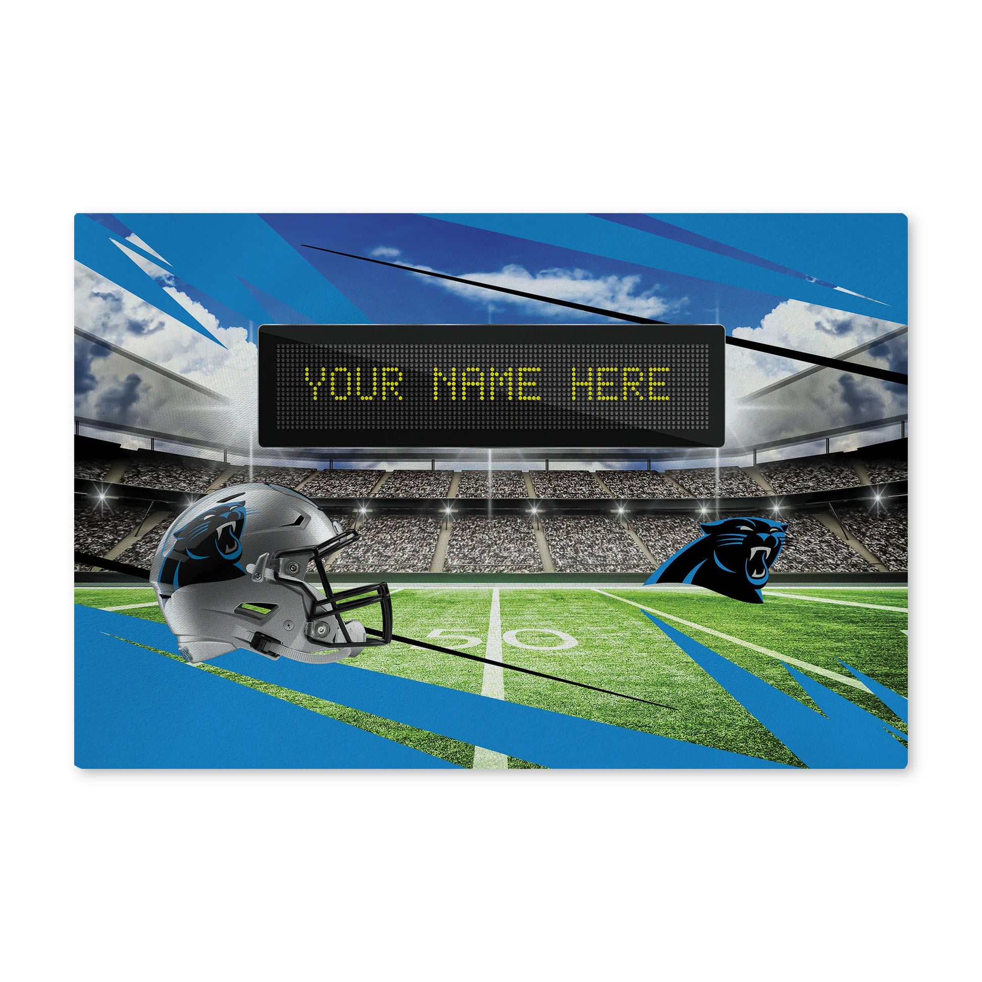 ? Features a football stadium, helmet and your favorite teams logo with a scoreboard ready for your personalization