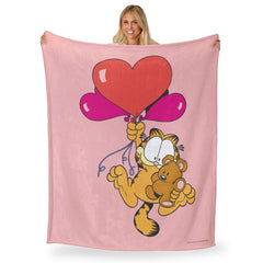 - Features Garfield and his Teddy Bear floating in the air holding heart balloons