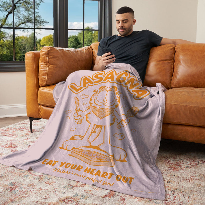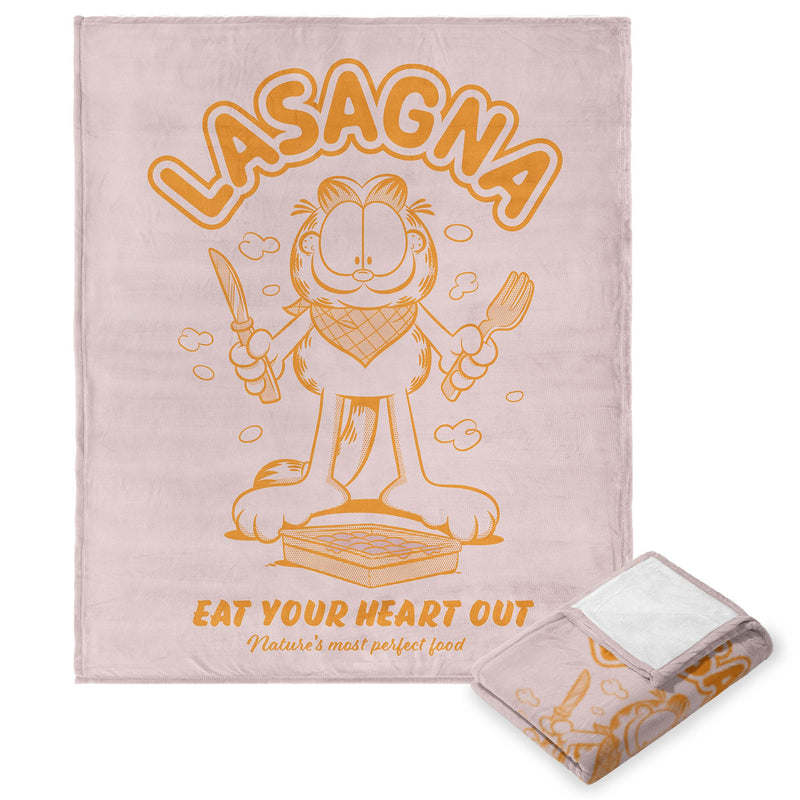 Satisfy your craving for comfort with the Garfield "Most Perfect Food" Silk Touch Throw! This cozy blanket showcases Garfield at his happiest, armed with a knife and fork, ready to dive into a delicious pan of lasagna. The word "lasagna" is proudly displayed above him, with a pan of his favorite dish below, making this throw a delightful tribute to Garfield's ultimate comfort food. Perfect for adding a touch of fun to your home decor, it's great for snuggling up on the couch, enhancing your bedding, or simply enjoying a lazy day. A fantastic gift for Garfield fans and lasagna lovers alike!