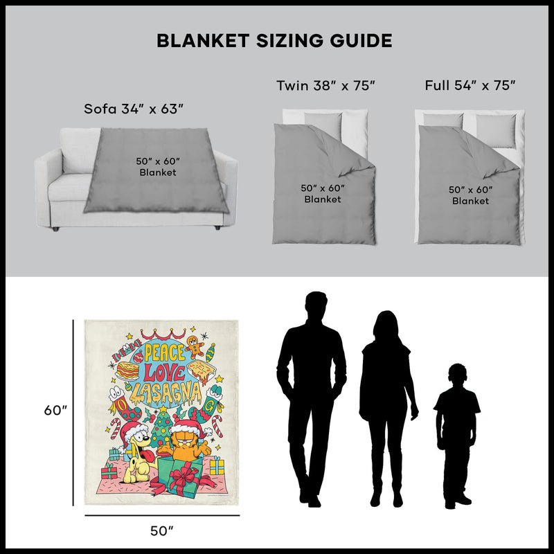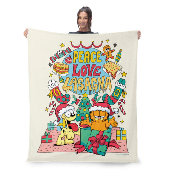 Relax in style with the Nickelodeon Garfield ¡°Peace Love Lasagna¡± Silk Touch Sherpa Throw Blanket. This festive blanket showcases Garfield and Odie in a delightful holiday scene, complete with a scrumptious plate of lasagna, stockings, wrapped gifts, and a Christmas tree. Garfield's and Odie's goofy charm make this throw a playful addition to any holiday d¨¦cor. Made with a soft Silk Touch fabric, this blanket offers both warmth and comfort during the chilly winter months. The colorful design captures the spirit of the season, blending Garfield's love for lasagna with the joy of holiday traditions. It's perfect for curling up on the couch, adding a touch of humor and festivity to your space. Ideal for Garfield fans or anyone who loves a good laugh with their holiday cheer, this throw is a fun and functional gift. Its cozy feel and vibrant design make it a standout piece for cozy nights or holiday gatherings, combining the best of classic cartoon charm with seasonal fun.