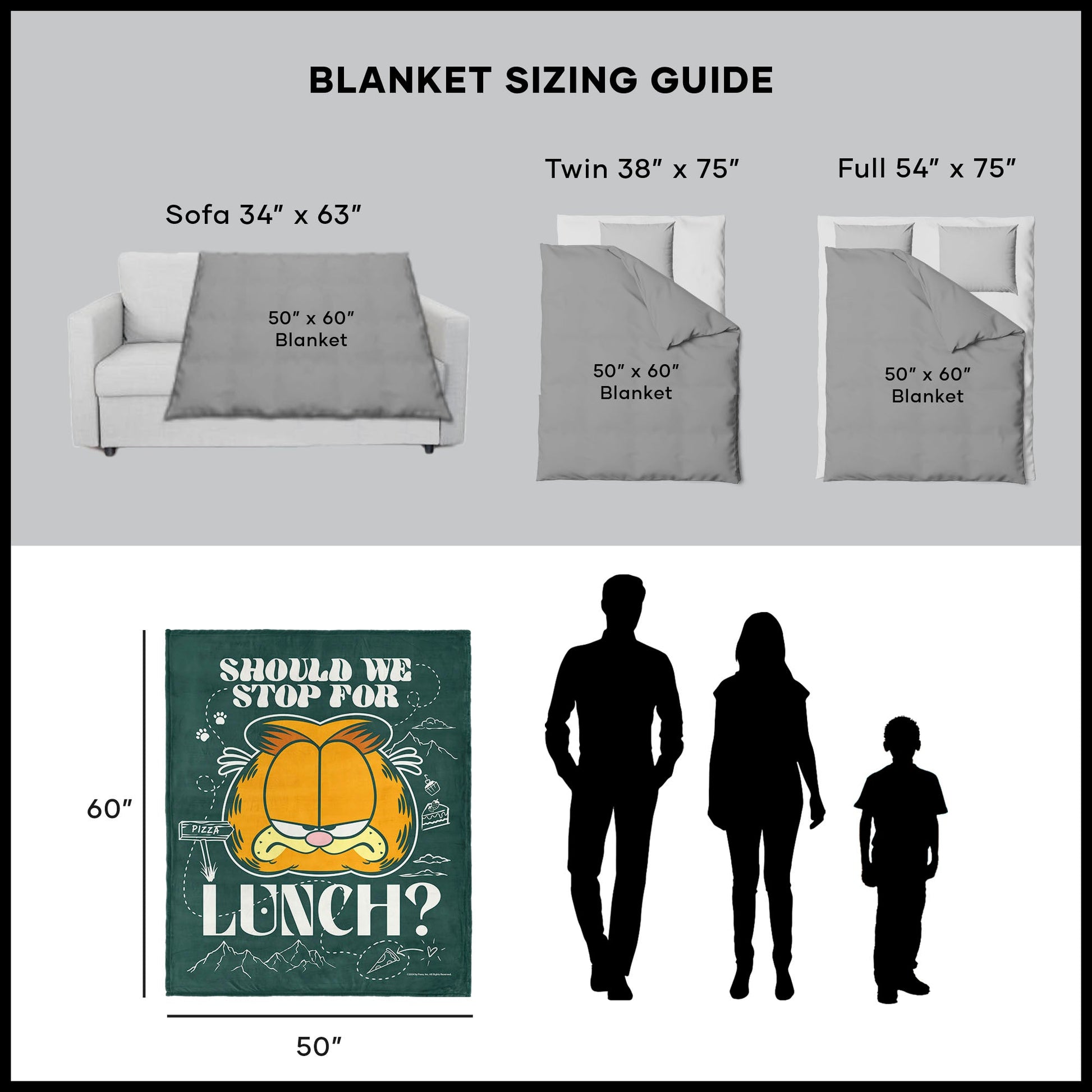 Garfield¡¯s love for food is on full display with this Silk Touch Sherpa Throw Blanket. Featuring an image of his head paired with the words ¡°Should we stop for lunch?¡± it¡¯s a fun nod to his famously big appetite and laid-back humor. Crafted from ultra-soft silk-touch fabric, this blanket is as comfortable as it is entertaining. Lightweight and smooth to the touch, it¡¯s perfect for cozying up on the couch, layering on your bed, or keeping nearby for a quick afternoon nap. Ideal for Garfield fans and foodies alike, this throw adds a touch of personality to any space. Let Garfield¡¯s signature wit remind you to take a break, enjoy the moment, and maybe even grab a snack.