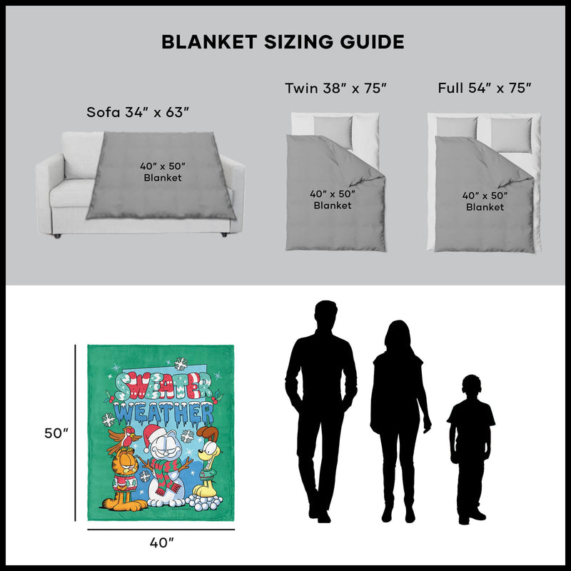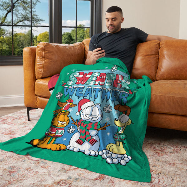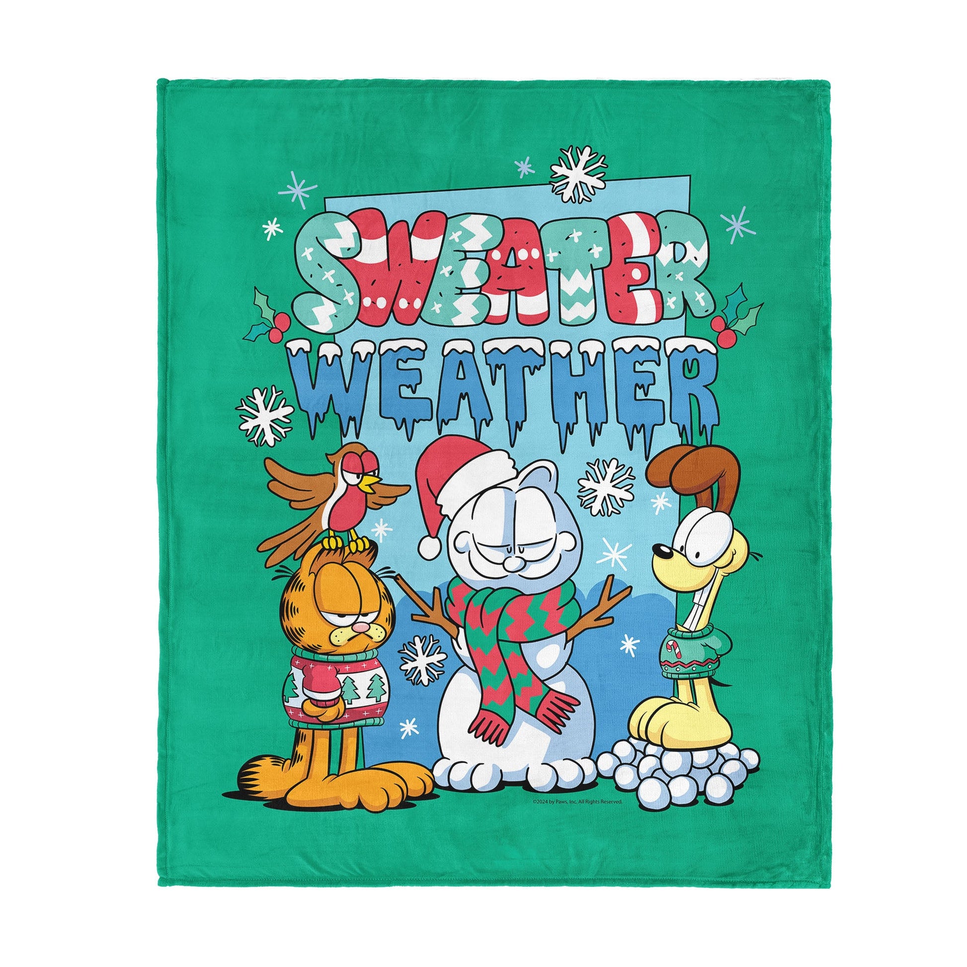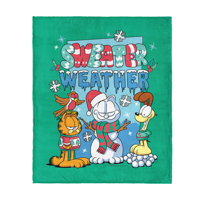 Cozy up in style with the Nickelodeon Garfield ¡°Sweater Weather¡± Silk Touch Throw Blanket. Garfield and Odie are dressed in festive holiday sweaters in the center, a snowman dressed as Garfield steals the show, bringing extra holiday cheer to the design. This playful and heartwarming blanket combines fun and comfort in one delightful package. Made from ultra-soft Silk Touch fabric, this throw is perfect for those chilly days when you want to relax in warmth and style. Its vibrant design captures the holiday spirit while showcasing Garfield's playful personality, making it an eye-catching addition to any room. Whether you¡¯re curled up on the couch or adding a cozy touch to your bed, this blanket is sure to keep you comfortable all season long. A must-have for fans of Garfield and the holiday season, this blanket makes the perfect gift or personal treat. Its cheerful, festive design and cozy texture make it an ideal companion for both relaxing evenings and holiday celebrations.