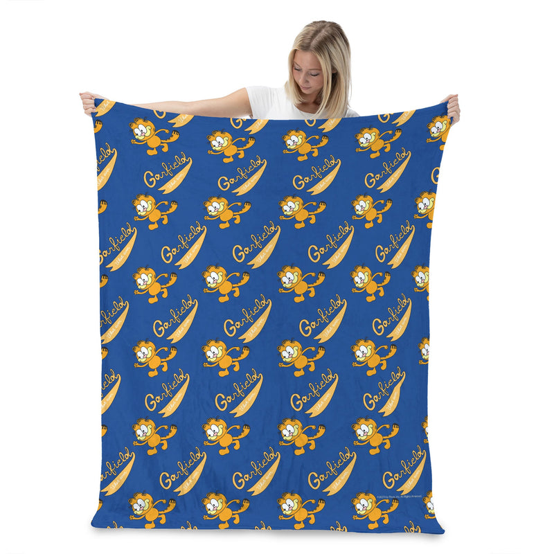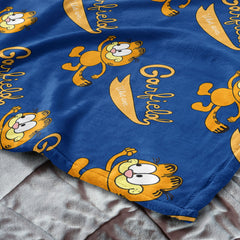 - Features a playful repeating pattern of Garfield and his name against a deep blue background