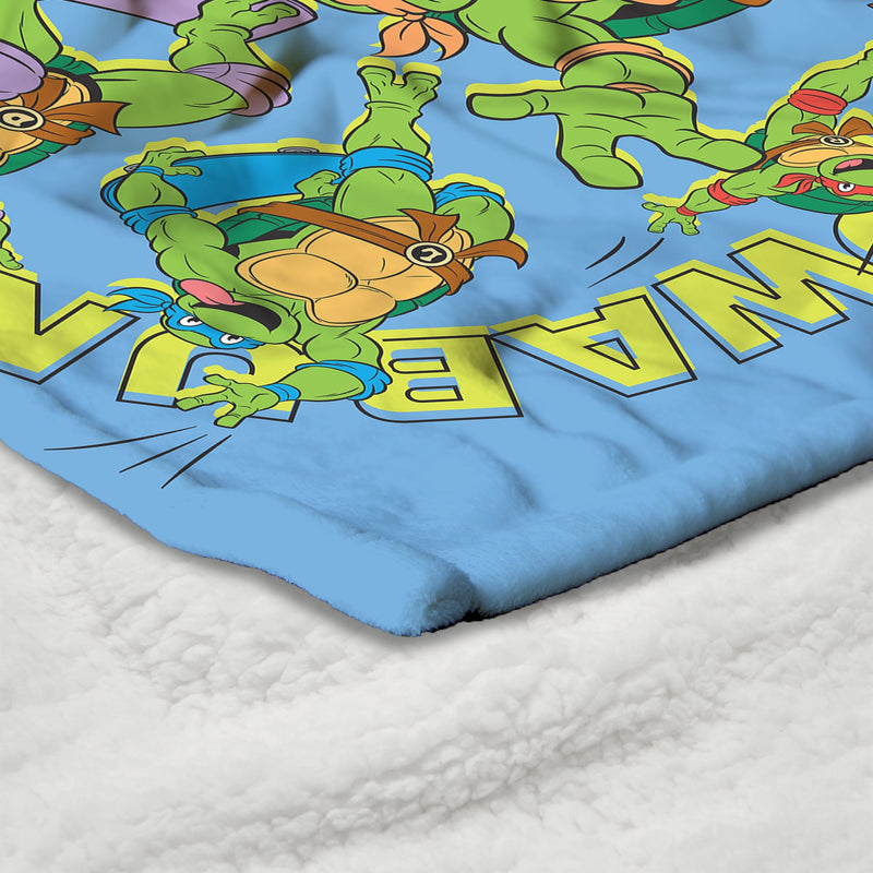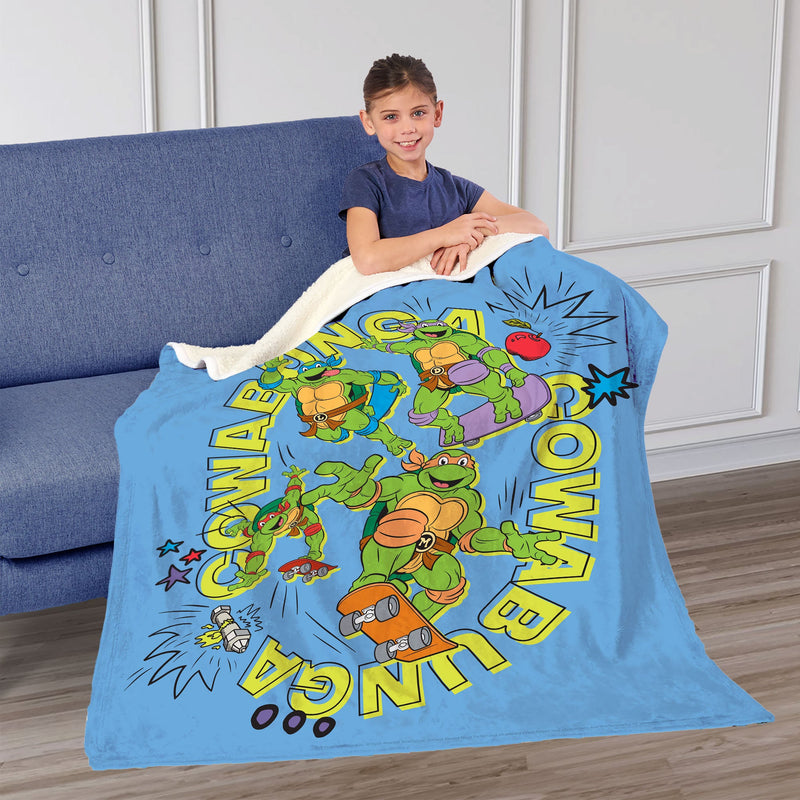 Get ready to roll with the Teenage Mutant Ninja Turtles as they zoom into action on the ¡°Cowabunga Turtles¡± Silk Touch Sherpa Throw Blanket! This vibrant and playful design showcases all four turtles shredding the streets on their skateboards, surrounded by the iconic battle cry, ¡°Cowabunga!¡± Whether you¡¯re a fan of Leonardo, Michelangelo, Donatello, or Raphael, this blanket brings the energy and excitement of the sewers straight to your space. With a cozy sherpa lining, this blanket is perfect for snuggling up on the couch or adding a touch of turtle power to your bed.