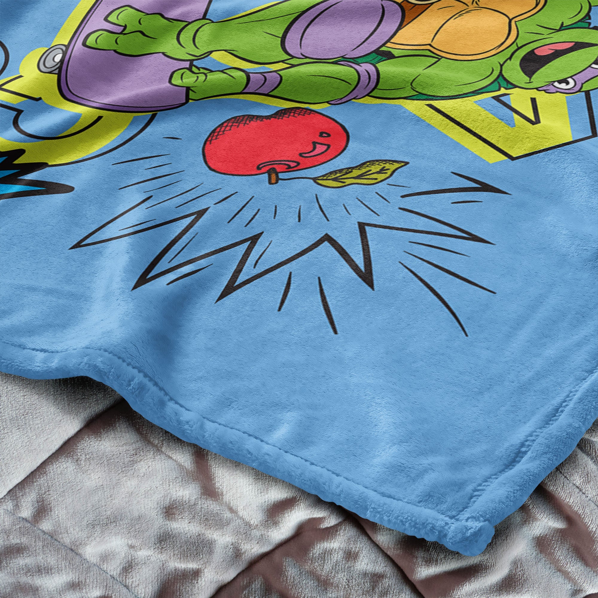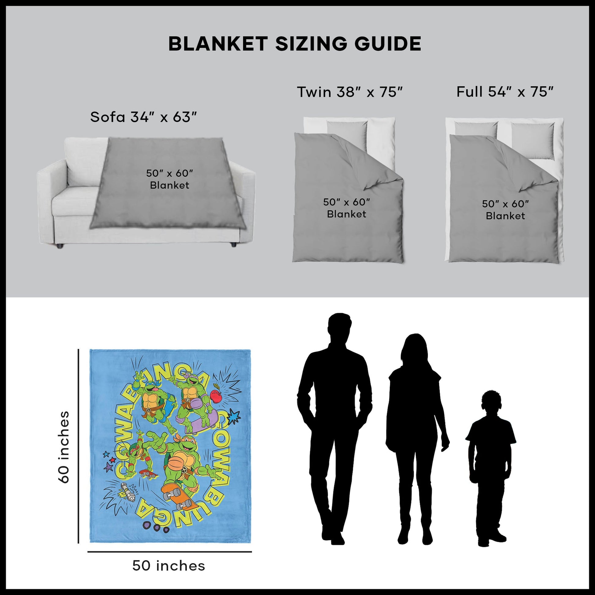 Get ready to roll with the Teenage Mutant Ninja Turtles as they zoom into action on the ¡°Cowabunga Turtles¡± Silk Touch Throw Blanket! This vibrant and playful design showcases all four turtles shredding the streets on their skateboards, surrounded by the iconic battle cry, ¡°Cowabunga!¡± Whether you¡¯re a fan of Leonardo, Michelangelo, Donatello, or Raphael, this blanket brings the energy and excitement of the sewers straight to your space. With a cozy sherpa lining, this blanket is perfect for snuggling up on the couch or adding a touch of turtle power to your bed.