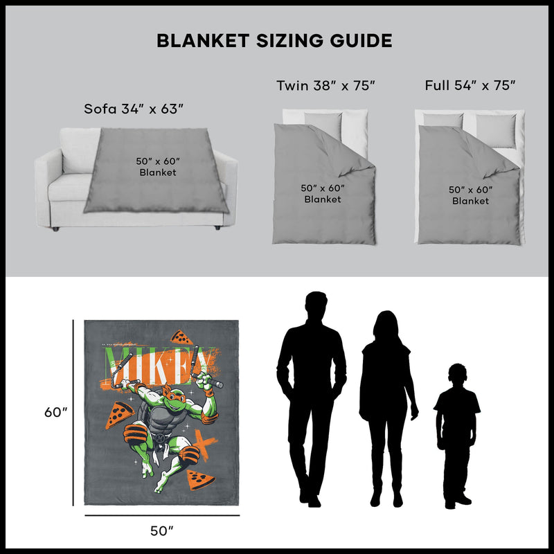 Bring the party to your space with the Teenage Mutant Ninja Turtles ¡°Mikey TMNT¡± Silk Touch Sherpa Throw Blanket! This awesome design features Michelangelo in his classic fighting stance, ready to take on any foe¡ªor just snag the nearest slice of pizza! With his name ¡°MIKEY¡± emblazoned in the background and pizza slices scattered around, this blanket is a fun tribute to the most easygoing, pizza-loving turtle in the crew. Perfect for chilling out after a long day of saving the city, this throw will keep you warm whether you¡¯re kicking back with some TMNT reruns or dreaming of your next pizza feast. The sherpa lining adds a cozy touch, making it the ultimate snuggle buddy.