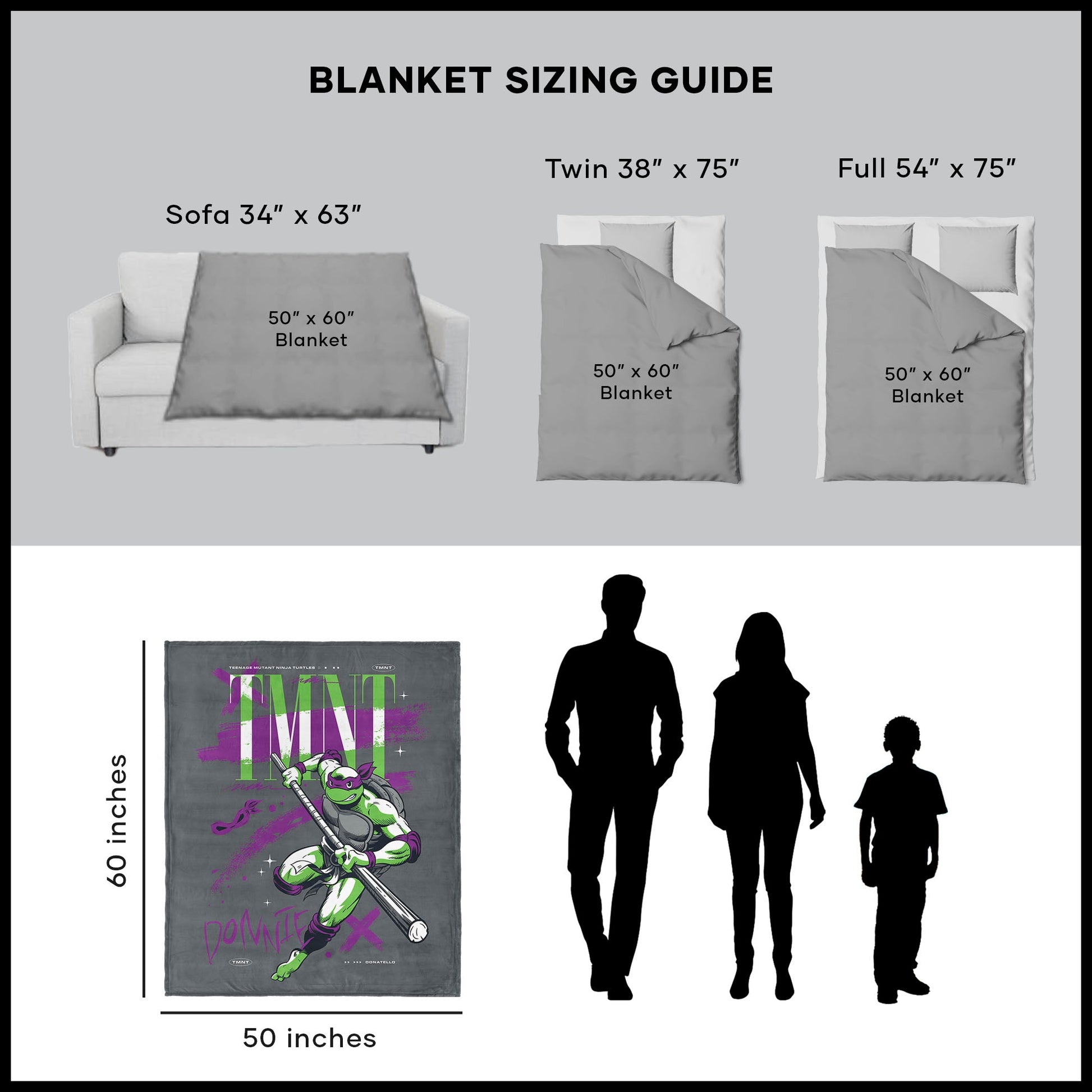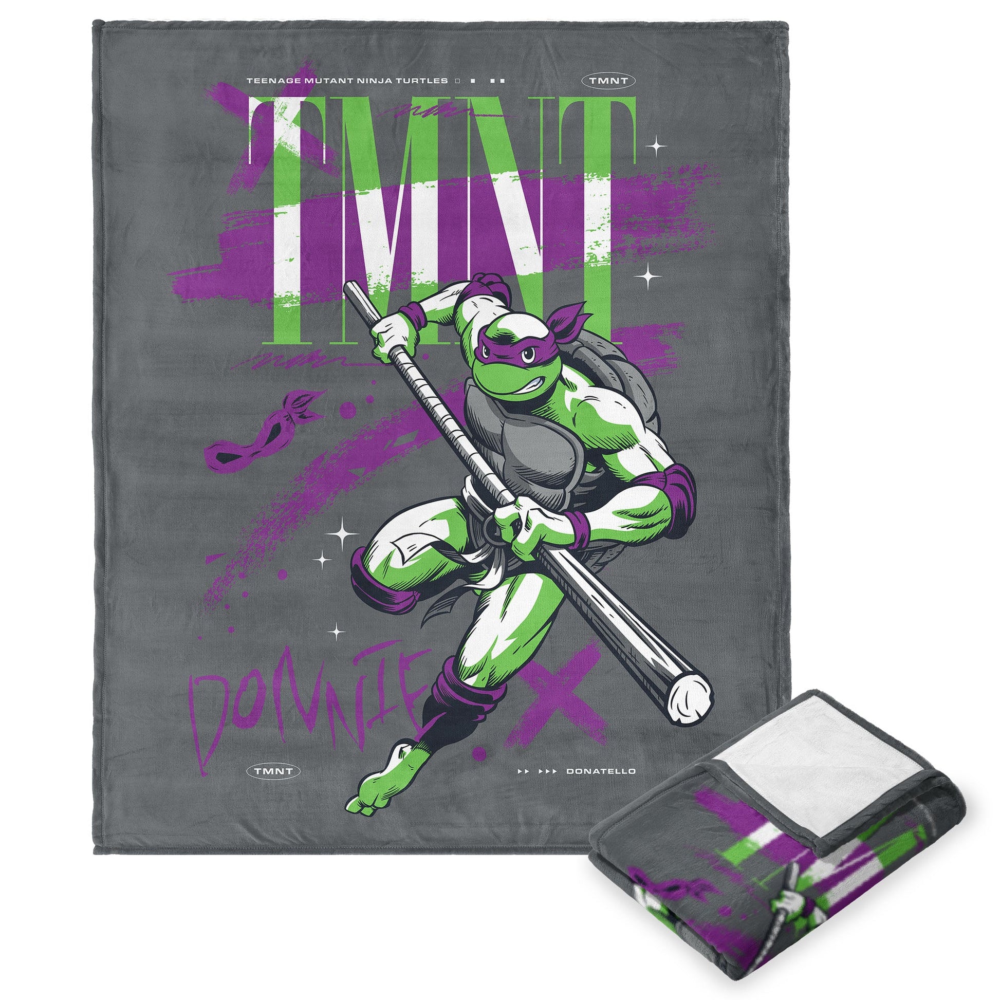 Step into the world of the smartest turtle in the sewers with the Teenage Mutant Ninja Turtles ¡°Donnie TMNT¡± Silk Touch Throw Blanket! This bold design showcases Donatello in a fierce fighting stance, ready to take on any challenge with his signature bo staff. With ¡°TMNT¡± proudly displayed in the background, this blanket captures the spirit of the tech-savvy hero, making it a must-have for any Donnie fan. Whether you¡¯re deep into a marathon of TMNT episodes or just chilling after a day of your own ninja adventures, this blanket wraps you up in warmth and comfort. The sherpa lining adds an extra layer of coziness that¡¯s perfect for those moments when you just want to relax and unwind.