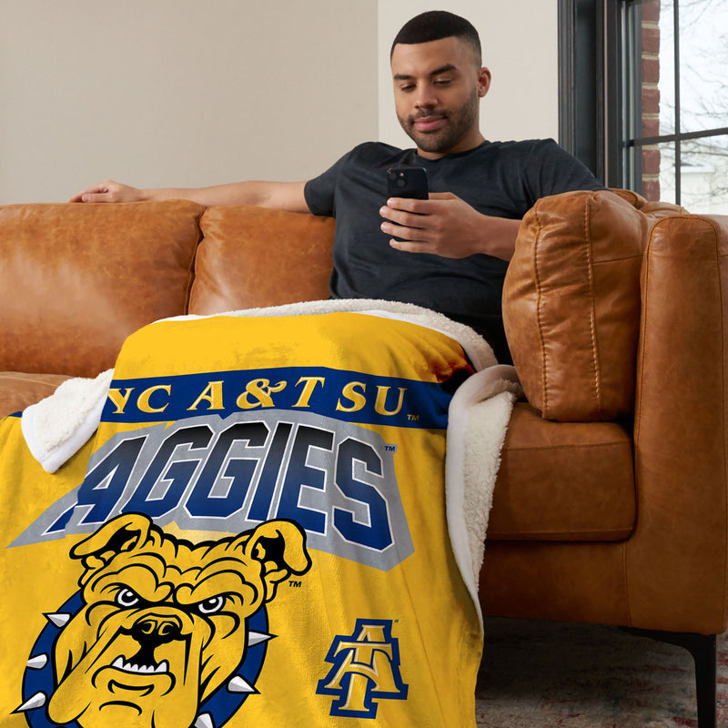 You'll never get cold cheering on your favorite team with this North Carolina A&T State University Silk Touch Sherpa Throw Blanket. Showcasing the team¡¯s bold logo and signature colors, this throw is designed to make a statement while keeping you comfortable during every game, study group, or lounging session. The luxurious Silk Touch front and soft Sherpa back combine to create an incredibly plush and comfortable blanket that you won¡¯t want to put down.