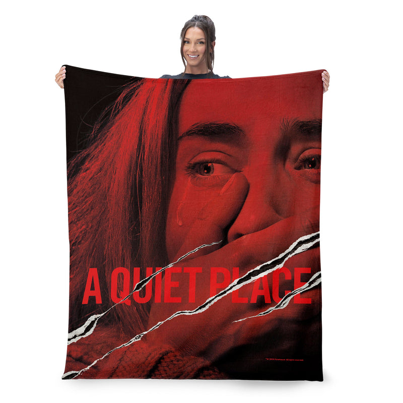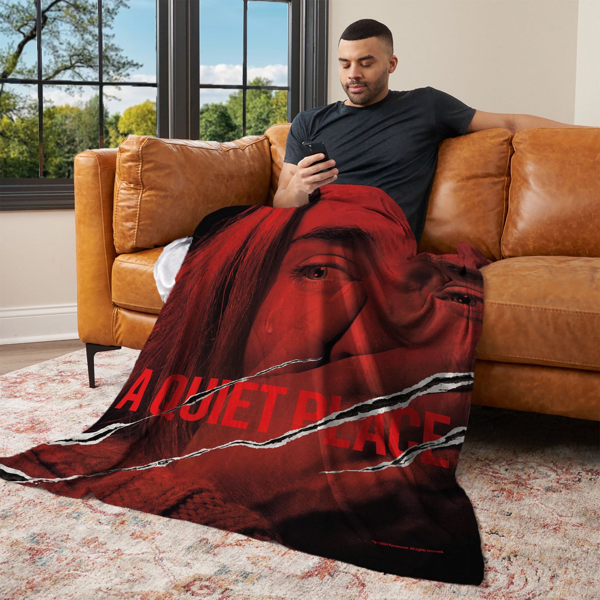 Wrap yourself in the haunting tension of A Quiet Place with this "Movie Poster" Silk Touch Throw Blanket, featuring Evelyn Abbott against a striking red backdrop. Capturing her intense, silent resilience, the design pulls you into the world of survival where every sound counts. The rich red hue and bold design create a visually powerful piece that stands out in any room, merging comfort with suspenseful storytelling. Ideal for movie marathons or a quiet night in, this blanket adds a cinematic edge to your space, immersing you in the story from the first look.