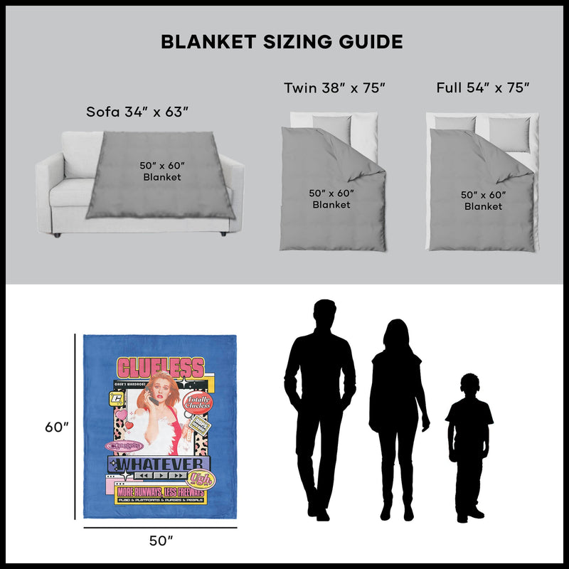 Bring a touch of ¡®90s nostalgia to your space with the Paramount Clueless "More Runways" Silk Touch Throw Blanket. Featuring an iconic image of Cher Horowitz set against a vibrant collage of stickers inspired by the film, this cozy throw is a must-have for any Clueless fan. Whether you¡¯re rewatching the classic teen comedy or just want to channel some Beverly Hills style, it¡¯s the perfect way to show off your love for the movie. Made from ultra-soft silk touch fabric, this blanket offers both comfort and style with its lightweight yet plush feel. The bold, high-quality print ensures that Cher¡¯s fashionable presence and the colorful Clueless-themed graphics pop with every detail. Generously sized for ultimate coziness, it¡¯s ideal for movie nights, lounging, or adding a trendy accent to your room d¨¦cor. A must-have for pop culture lovers and fashionistas alike, this throw makes an amazing gift or personal indulgence. Whether draped over a bed, styled on a couch, or wrapped around you for warmth, it brings a fun and nostalgic flair to everyday life. Stay comfy in true Cher Horowitz style and make every moment a little more fabulous.