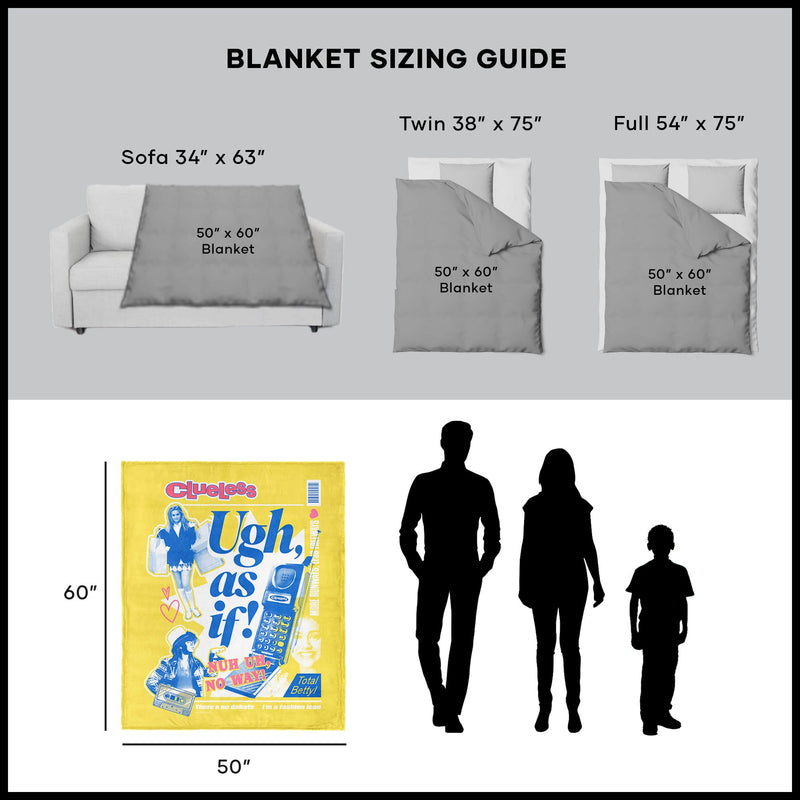 Upgrade your space with a touch of Beverly Hills attitude with the Paramount Clueless "Ugh As If" Silk Touch Sherpa Throw Blanket. Featuring an image of Cher Horowitz holding shopping bags, this stylish throw brings her signature sass and iconic fashion sense to life. Boldly displaying the phrase "Ugh As If" in the center, along with an array of fun, representative images from the movie, it¡¯s the ultimate tribute to the classic ¡®90s film. Made from ultra-soft silk touch fabric, this blanket delivers both comfort and style in one chic package. The high-quality print ensures that every detail¡ªfrom Cher¡¯s flawless outfit to the nostalgic Clueless-inspired graphics¡ªremains vibrant and eye-catching. Lightweight yet warm, it¡¯s perfect for cozying up during movie nights, lounging in style, or adding a trendy accent to any room. A must-have for fashion lovers, pop culture fans, and anyone who can quote the movie word for word, this throw makes an excellent gift or personal indulgence. Whether draped over a bed, styled on a couch, or wrapped around you for warmth, it¡¯s the perfect way to channel Cher¡¯s iconic energy. Stay cozy, stay stylish, and embrace your inner Clueless queen with every snuggle.