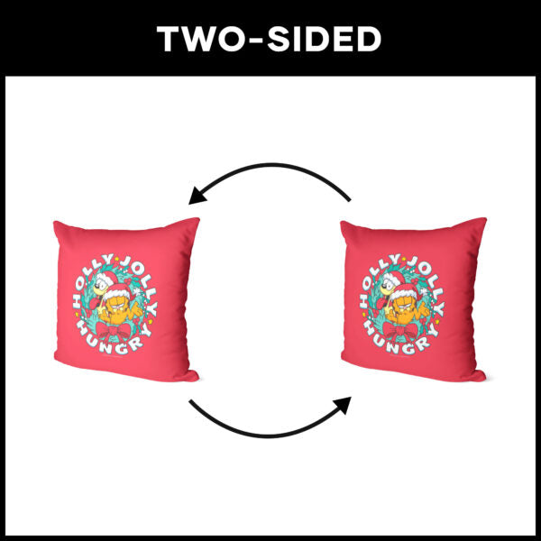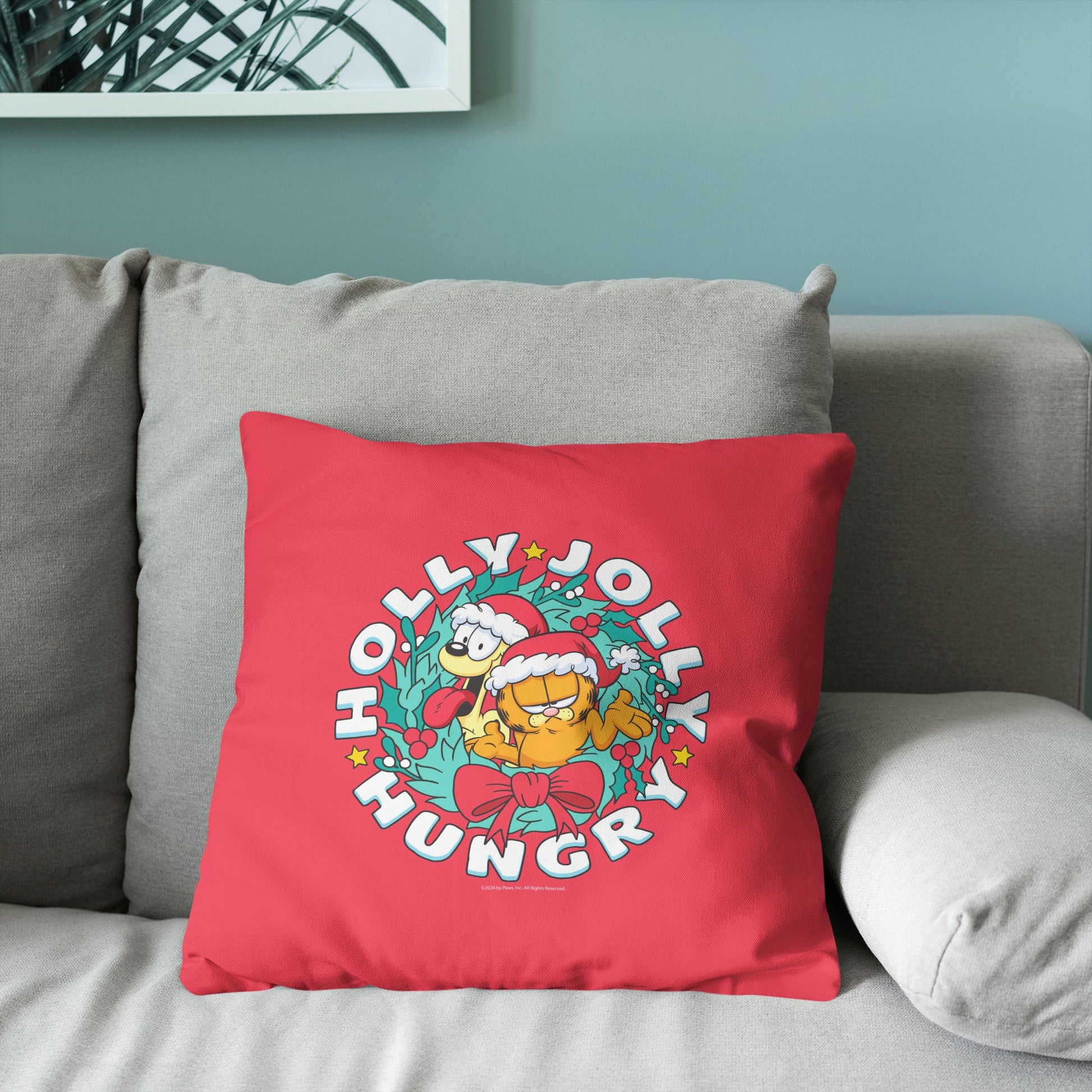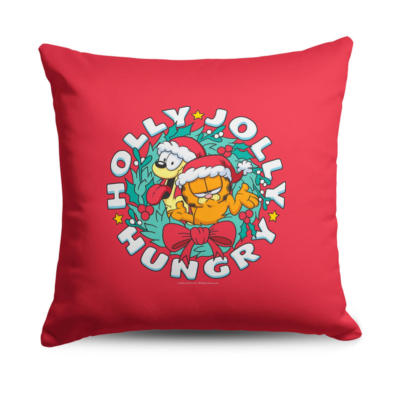 Bring humor and holiday cheer to your space with the Paramount Garfield ¡°Holly Jolly Hungry¡± Throw Pillow. Garfield and Odie peek out from a festive holiday wreath, their playful expressions perfectly capturing the season's joy. The words ¡°Holly Jolly Hungry¡± frame the wreath on a bold red background, adding a fun and relatable touch. Crafted with soft, high-quality fabric, this throw pillow combines comfort with a vibrant design. The rich red backdrop highlights the whimsical wreath and characters, making it a standout addition to your living room, bedroom, or favorite cozy corner. Whether paired with other holiday decorations or displayed on its own, it's a charming seasonal accent. Ideal for Garfield fans and holiday enthusiasts, this pillow blends humor, warmth, and festive flair. It's a thoughtful gift or a delightful way to sprinkle some holiday magic and personality into your home d¨¦cor.