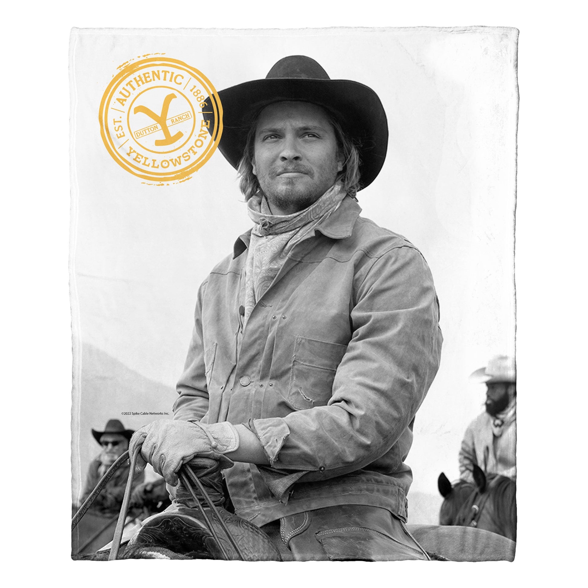 - Features a black and white image of Kayce Dutton and a gold Authentic Yellowstone logo stamp