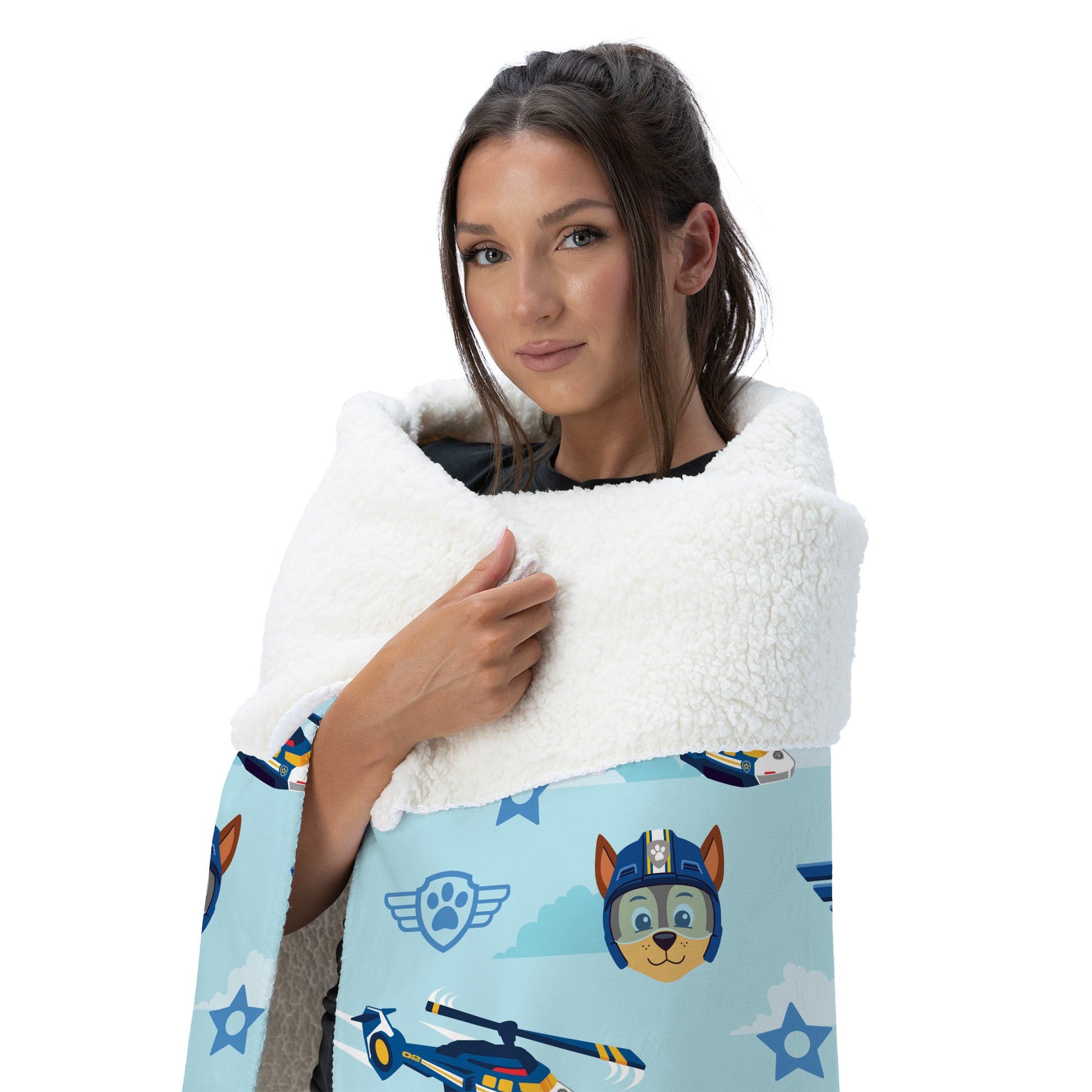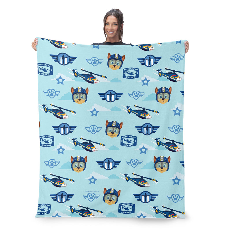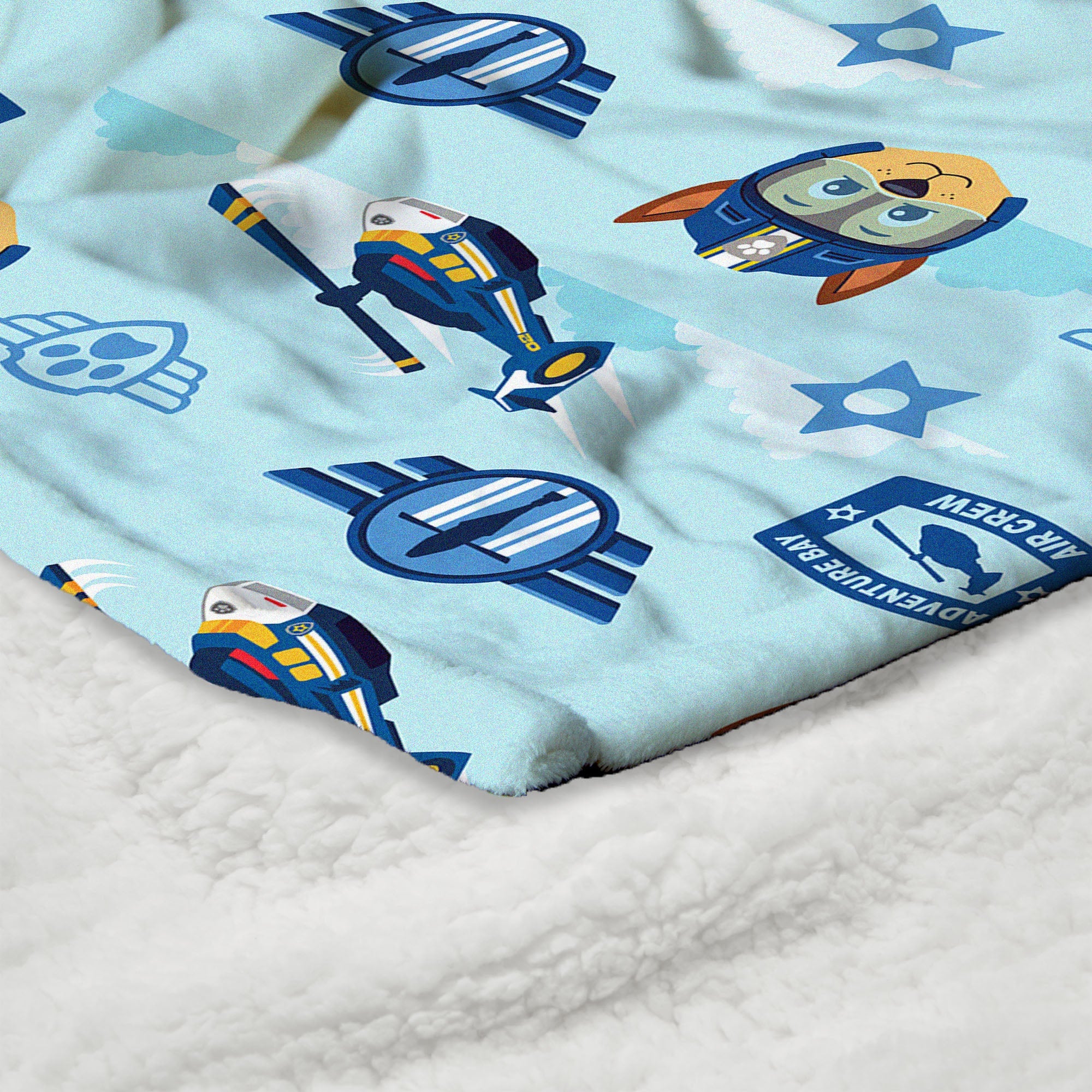Adventure takes flight with the Nickelodeon Paw Patrol "Chase Rescue Pattern" Silk Touch Sherpa Throw Blanket. Featuring Chase in full flight gear and an all-over pattern of helicopters, wings, badges, and cloud accents, this design channels the excitement of Adventure Bay¡¯s sky missions. Fun aviation symbols and soft blue tones make it a standout piece for young fans. Crafted from silky smooth, lightweight fabric, this blanket is perfect for snuggling during TV time, nap breaks, or travel. Soft to the touch and easy to care for, it¡¯s designed for comfort while holding up to everyday adventures. Ideal for bedrooms, play areas, or on-the-go fun, this throw adds a bold splash of Paw Patrol style. Whether they're dreaming of becoming part of the Air Crew or just looking for a cozy companion, kids will love wrapping up in this high-flying favorite.