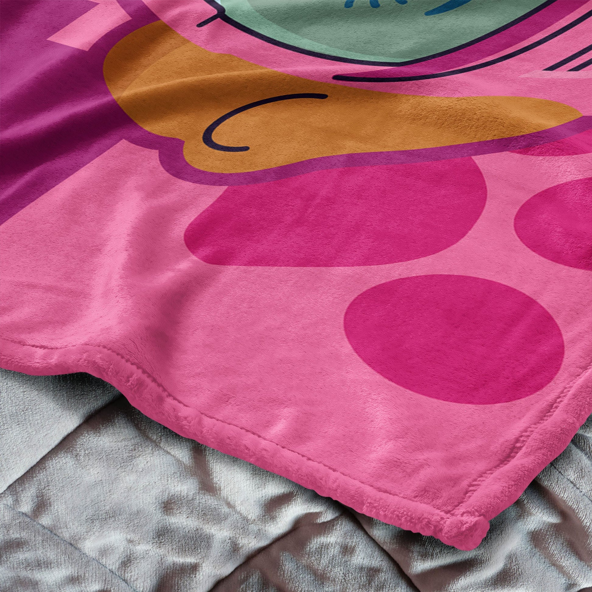 - Oversized; super soft, silk touch fabric front; plush, neutral color sherpa back; decorative binding around all edges