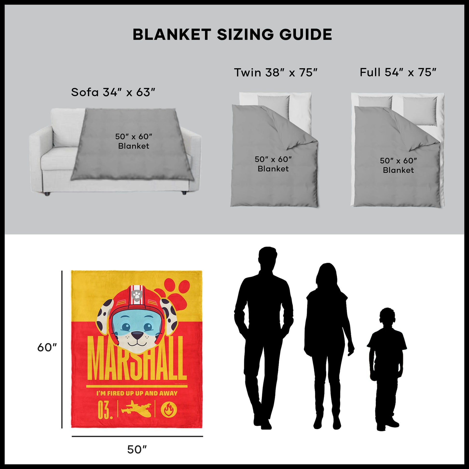 Get fired up for fun with the Nickelodeon Paw Patrol "Marshall Fired Up" Silk Touch Sherpa Throw Blanket. Featuring a vibrant design of Marshall in his red flight helmet with aviation-inspired icons and his catchphrase ¡°I¡¯m Fired Up Up and Away,¡± this blanket brings bold color and energy to any space. A bright red and yellow palette adds extra excitement for fans of the high-spirited pup. Made with luxuriously soft Silk Touch fabric, this blanket is perfect for cozying up on the couch, snuggling in bed, or keeping warm on road trips. Its lightweight feel and durable construction make it great for everyday use, whether at home or on the go. Perfect for Paw Patrol-themed rooms or cuddle-time adventures, this blanket is a must-have for kids who love action-packed missions and their favorite fired-up pup. It¡¯s a fun, functional piece that keeps young fans warm and smiling.